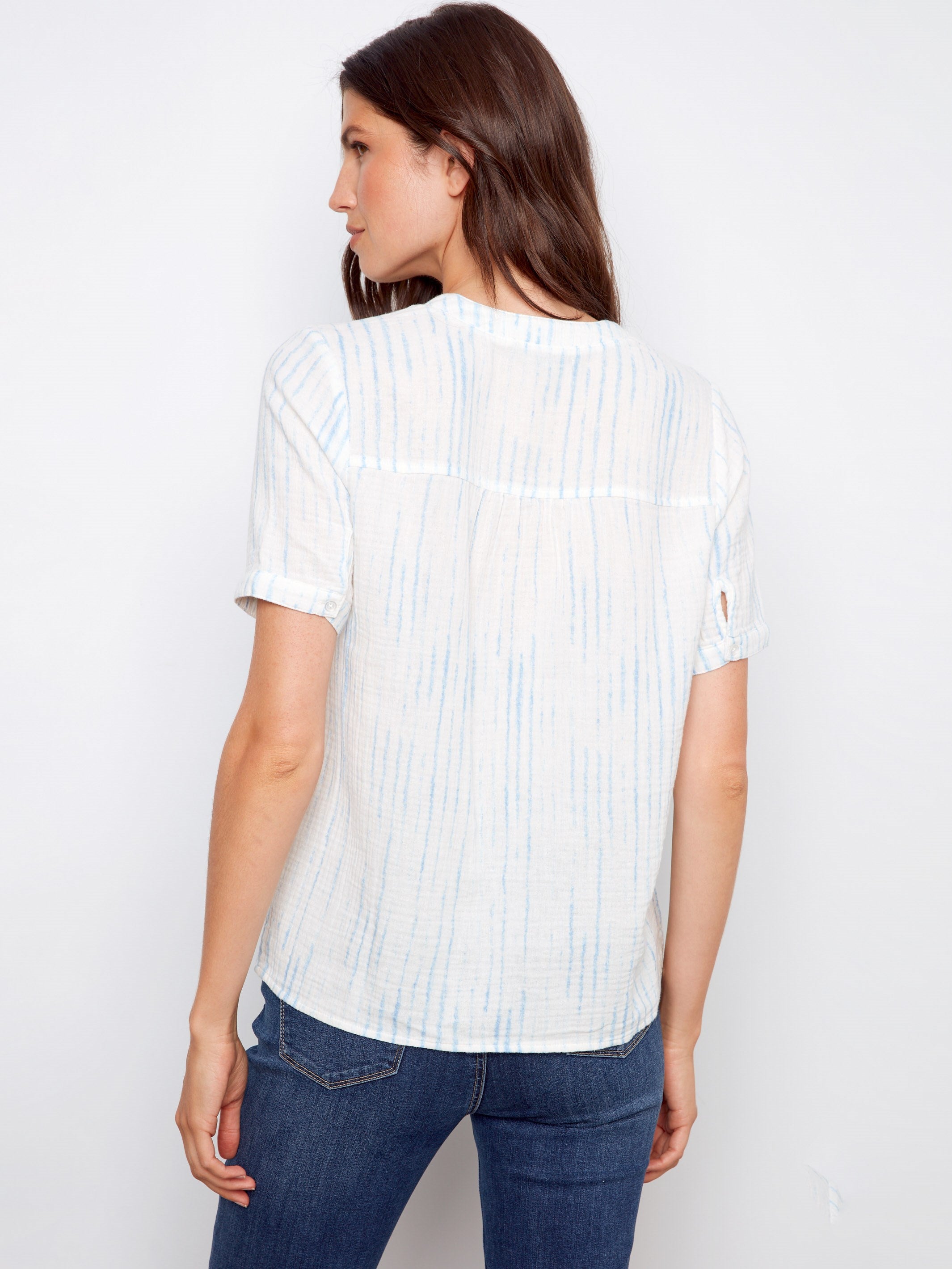 Step into breezy elegance with this bubble cotton blouse! With its soft, airy fabric and charming split neckline, this blouse is ideal for warm, sunny days. The subtle stripes add sophistication, making it a versatile piece for any casual outing or relaxed gathering. Enjoy comfort and style effortlessly!