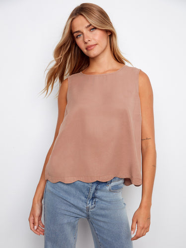 Embrace the sun with our elegantly chic sleeveless top, designed to elevate your spring wardrobe. Crafted from ultra-soft Tencel, it showcases a delightful scalloped hem and decorative back buttons for added sophistication. The tranquil desert brown shade offers a serene flair, making it an essential piece for a refreshing and stylish appearance. Add this timeless gem to your collection and bask in sunny radiance.