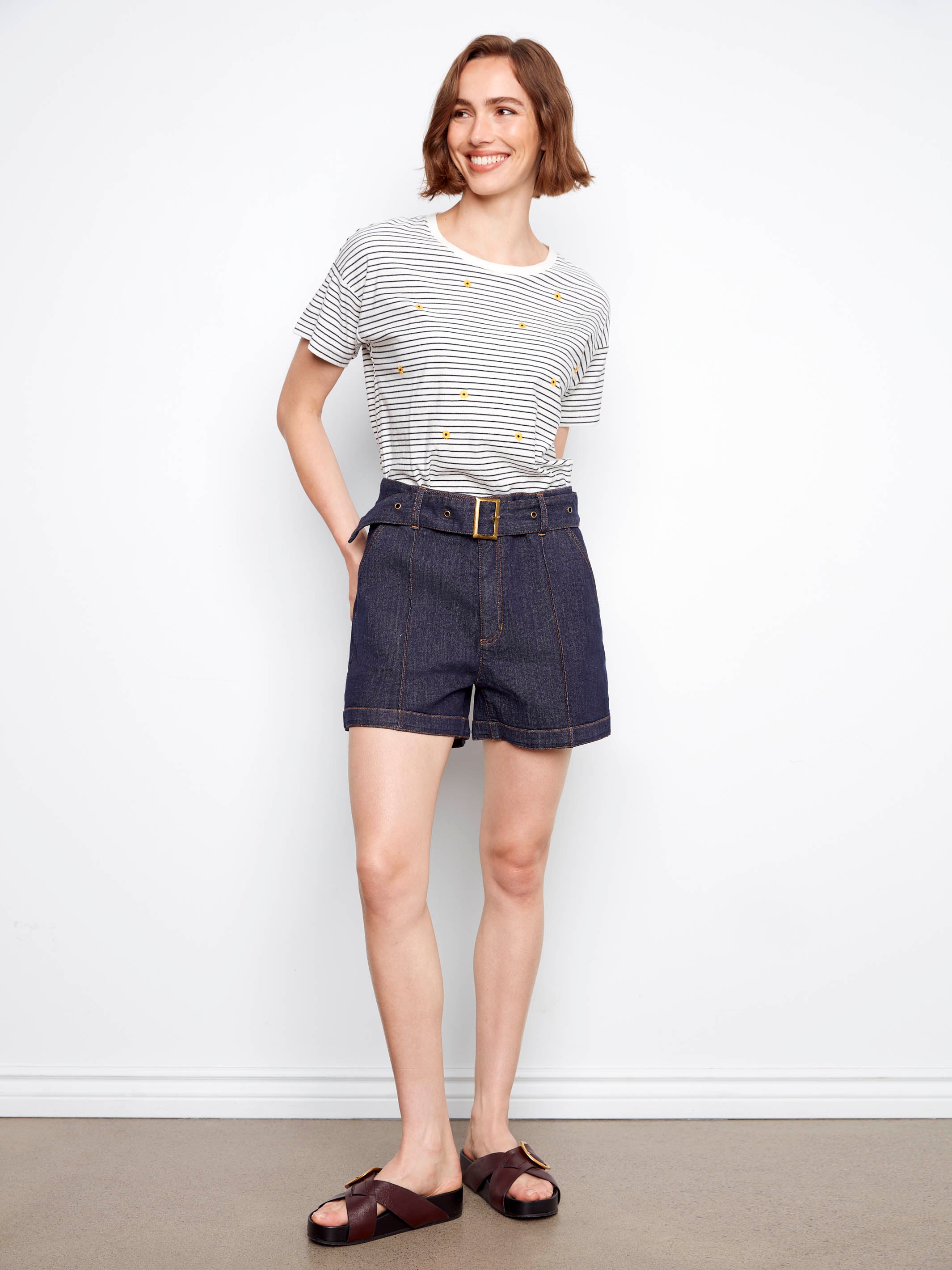 Belted Stretch Denim Shorts - Deep Blue