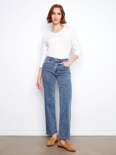 The Chloe wide jeans feature a mid-rise design with a wide leg silhouette that combines comfort and contemporary style. These medium blue jeans are crafted from stretch denim to provide flexibility and ease of movement. Designed with a regular length, a classic five-pocket construction, and a regular rise, they offer a versatile option that can be paired with both casual and dressier looks.