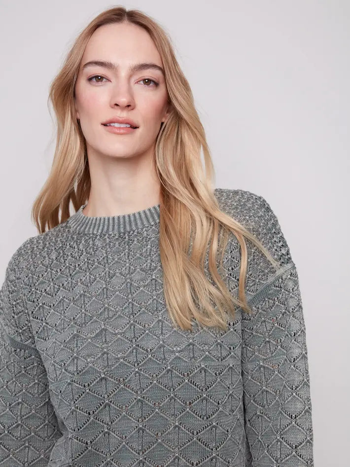 La teinte épinette apporte de la chaleur à n'importe quelle tenue, et le motif en pointelle ajoute une texture unique. Ce chandail est à la fois douillet et respirant, idéal pour passer d'une saison à l'autre.