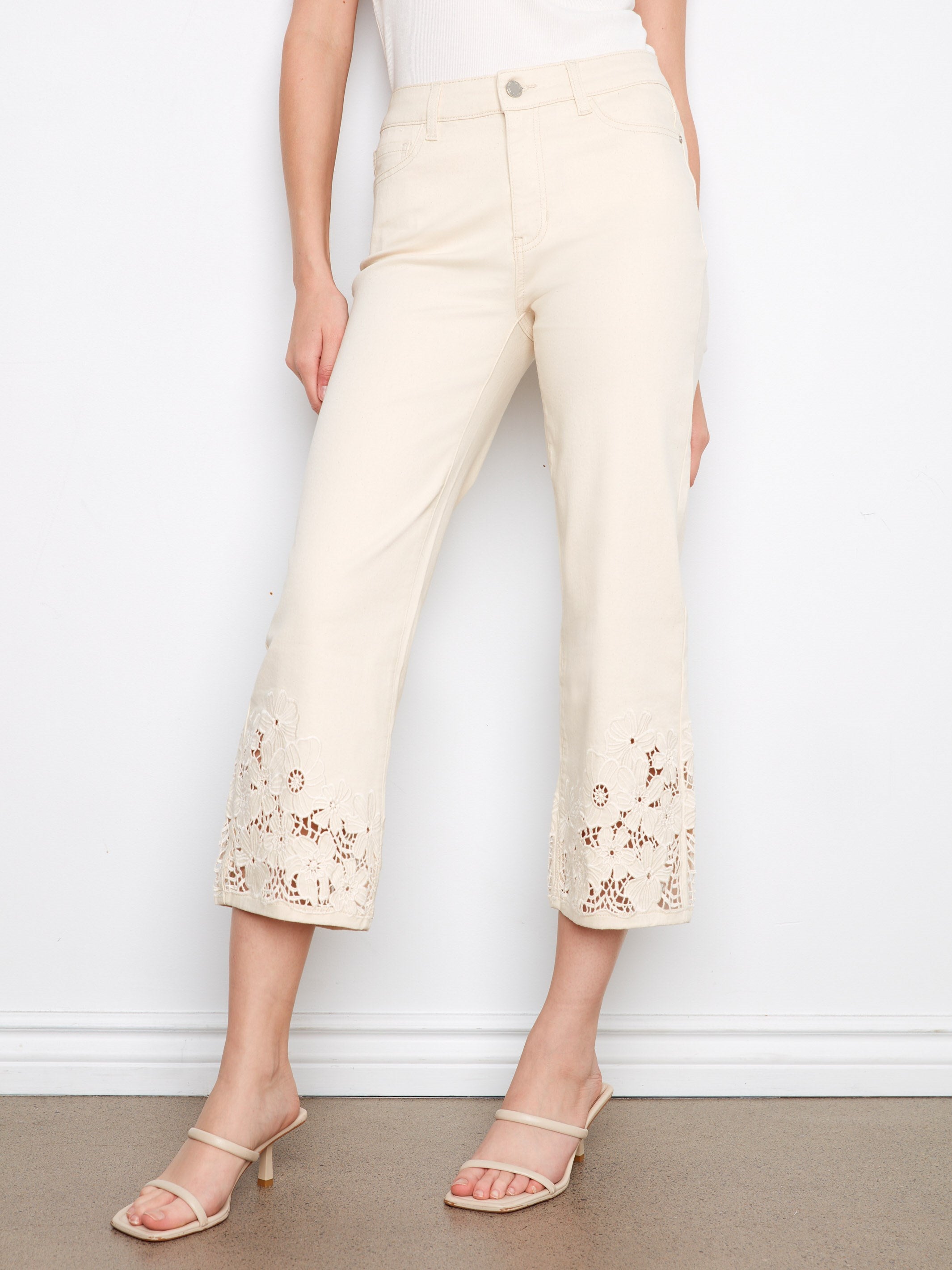 Rafraîchissez votre garde-robe printanière avec notre jean en sergé écourté évasé dans une teinte blanc cassé naturel. Sublimé par un délicat ourlet en dentelle florale découpée au laser, il apporte une touche unique à une silhouette facile à porter au quotidien. Une pièce incontournable que vous adopterez tout au long de la saison.