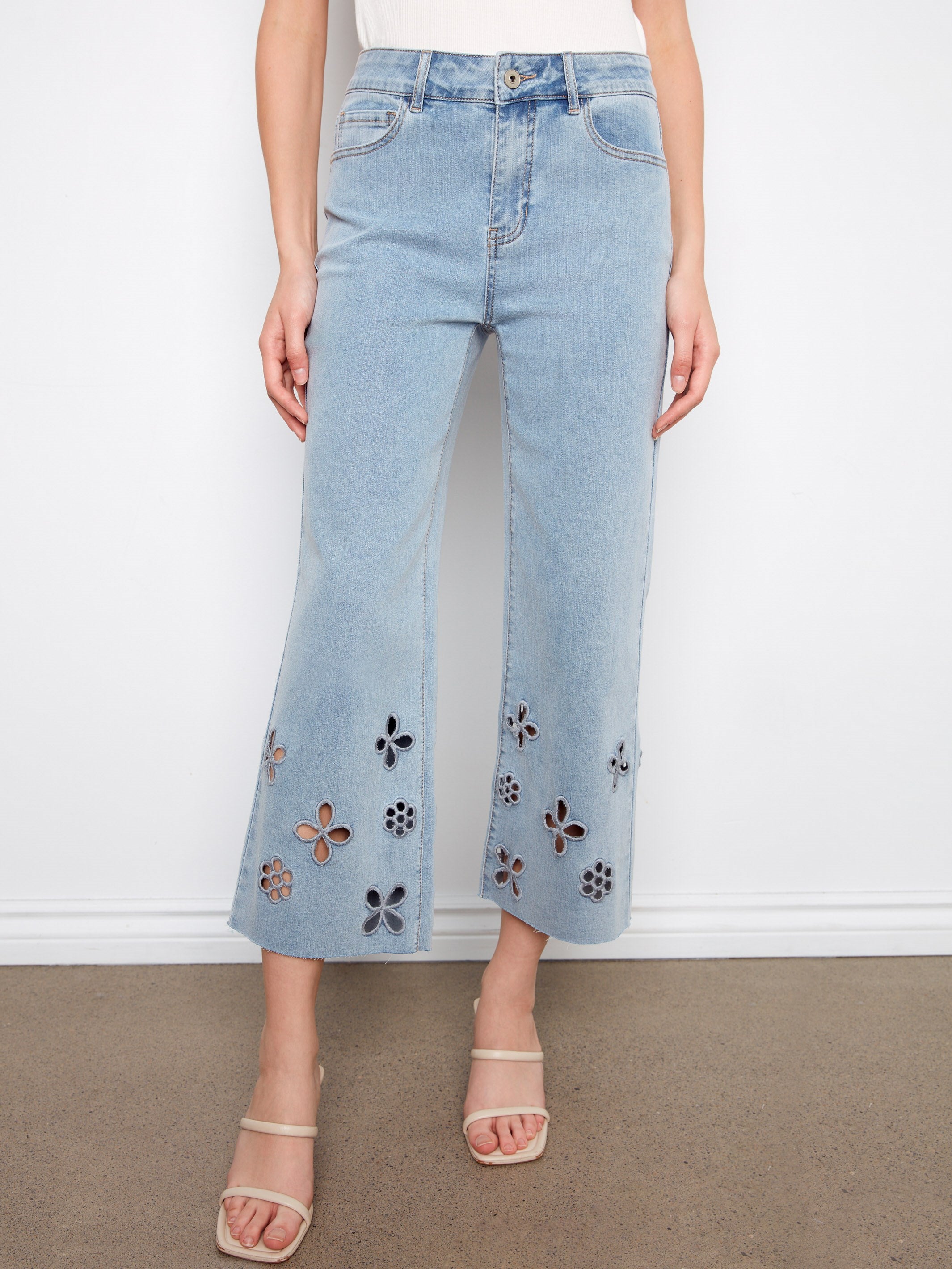 Jean à jambe large avec découpes florales - Bleu Pâle