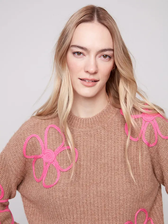 Adoptez l’esprit joyeux de l’automne-hiver avec notre chandail à col ras du cou à fleurs en soutache. Ses détails floraux en soutache rose vif contrastent parfaitement avec le fond brun truffe chiné, apportant une touche amusante et raffinée à votre garde-robe. Confortable et extensible, il deviendra un incontournable de la saison.