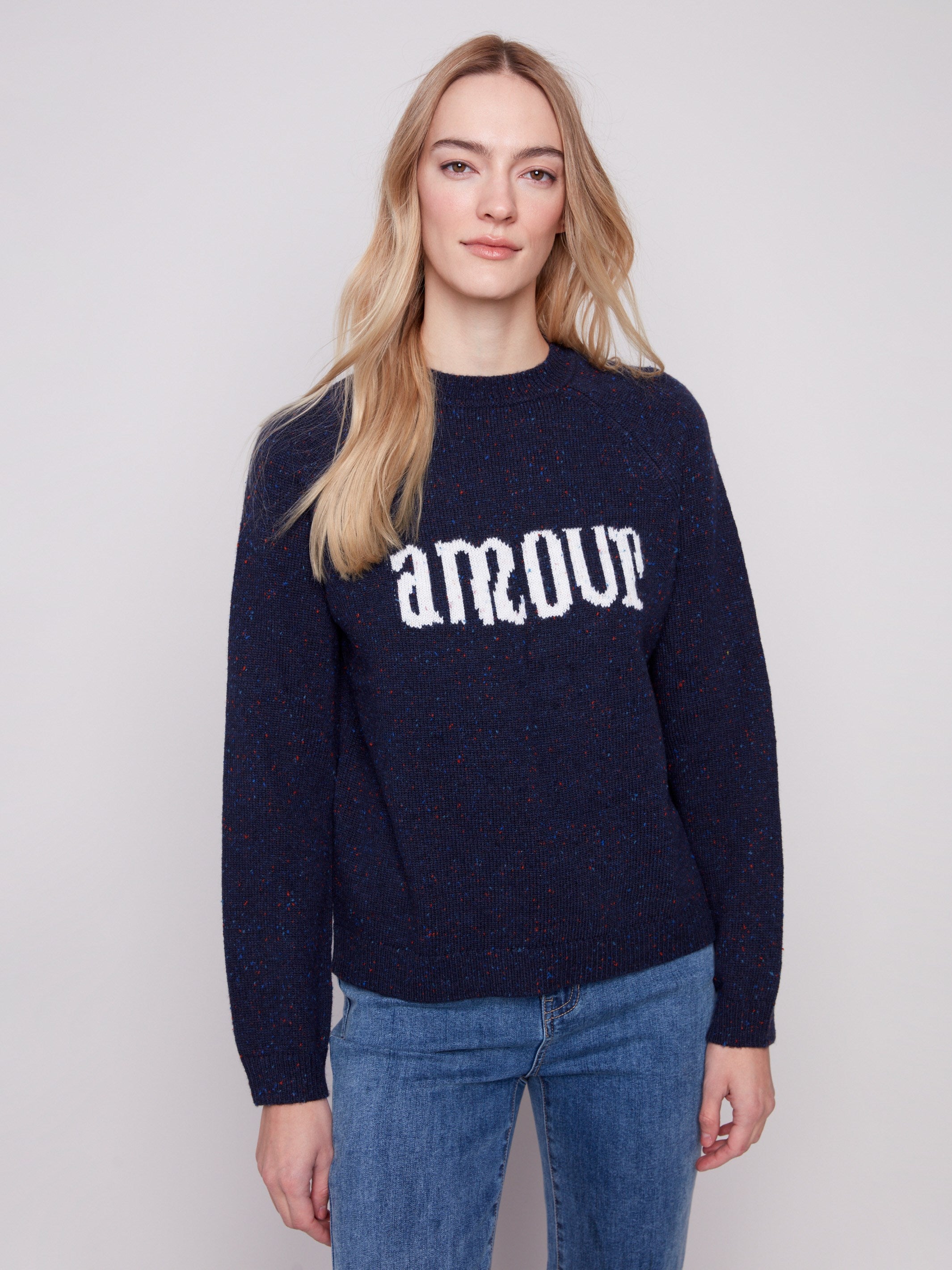Chandail Amour en fil neps à col montant - Marine Chiné