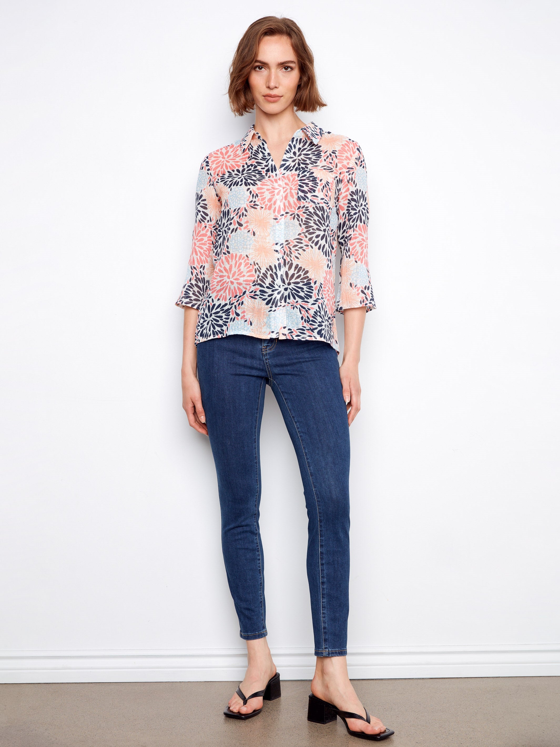 Rafraîchissez votre garde-robe avec notre blouse en gaze de coton imprimée, conçue pour se démarquer par son imprimé abstrait et coloré. Dotée de manches retroussables élégantes et d’un col classique, cette blouse allie aisance et personnalité avec un charme naturel. Parfaite pour vos aventures printanières.