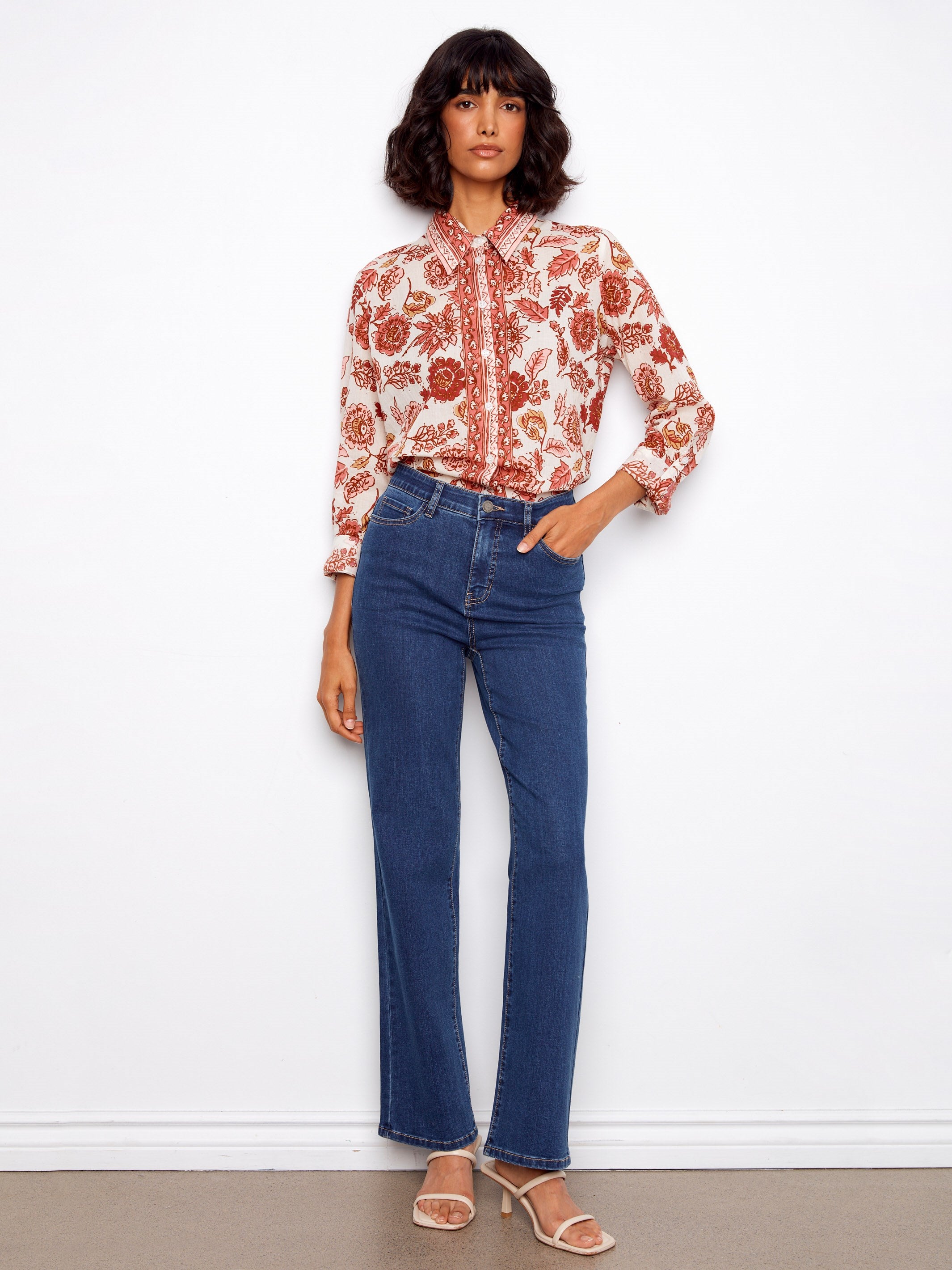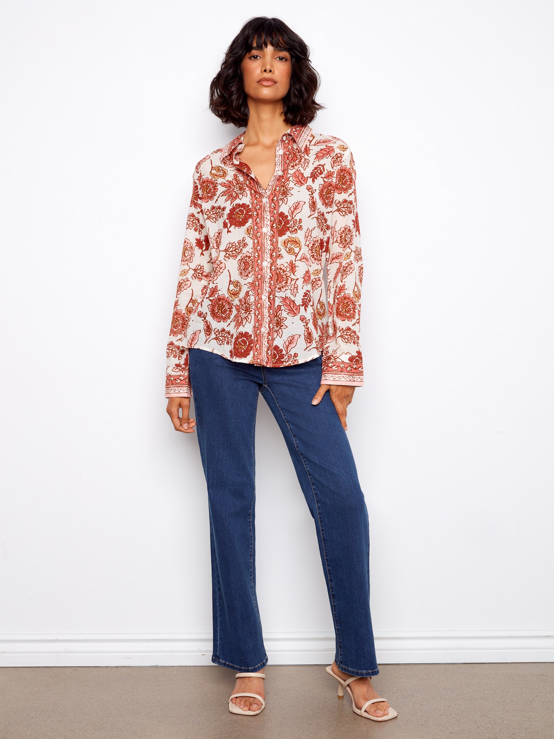 Renouvelez votre garde-robe de printemps avec notre blouse boutonnée en voile de coton imprimé, ornée d’un magnifique motif floral dans des nuances éclatantes de rouge qui se déploie avec grâce sur le tissu. Dotée d’un col chemise et de manches longues, cette blouse dégage une élégance naturelle, tandis que son coton léger et respirant assure un confort tout au long de la journée. Parfaite pour toutes les occasions, c’est un indispensable de la saison.