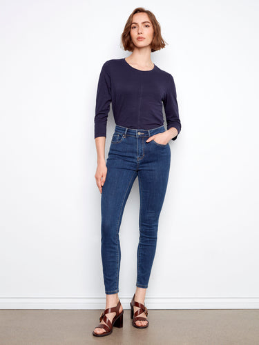 Slip into these stylish Carine skinny jeans in Indigo blue and elevate your everyday style. Featuring a flattering fit, they offer versatility, effortlessly transitioning from day to night. Perfect for pairing with a chic blouse or a casual tee, these skinny jeans for women are the ultimate spring wardrobe staple you've been searching for. A timeless pair of indigo jeans —they bring classic depth and a sleek silhouette to any outfit.