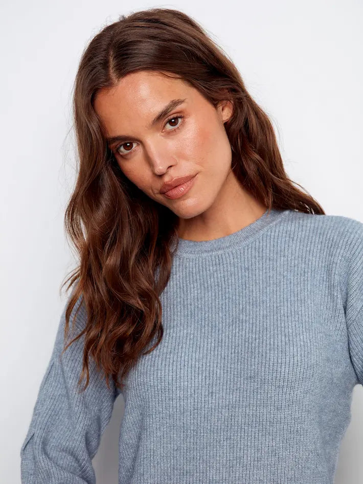 Crew Neck Sweater With Cable Sleeve Detail - Heather Denim