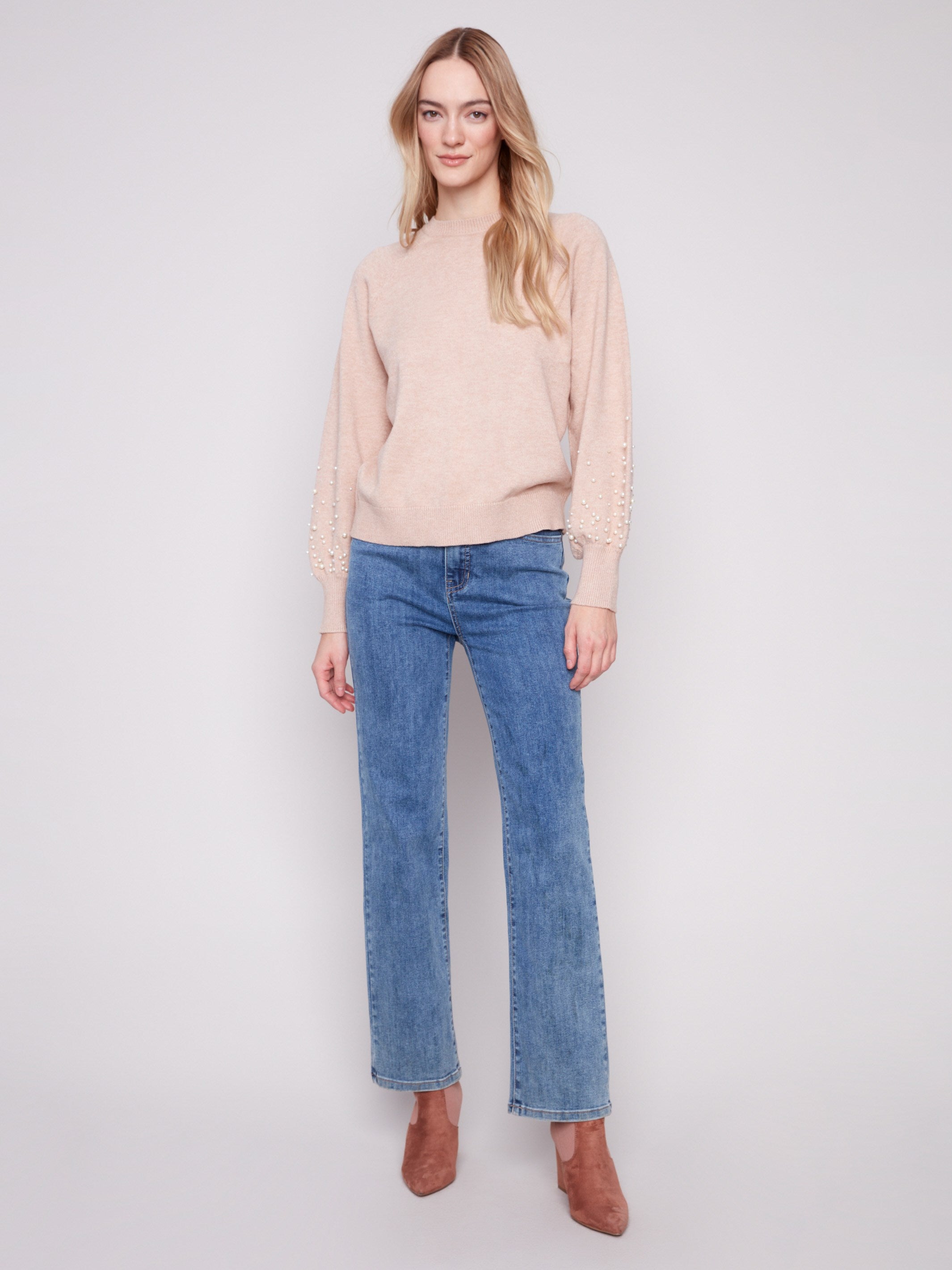 Crew Neck Sweater With Pearl Details - Heather Camel