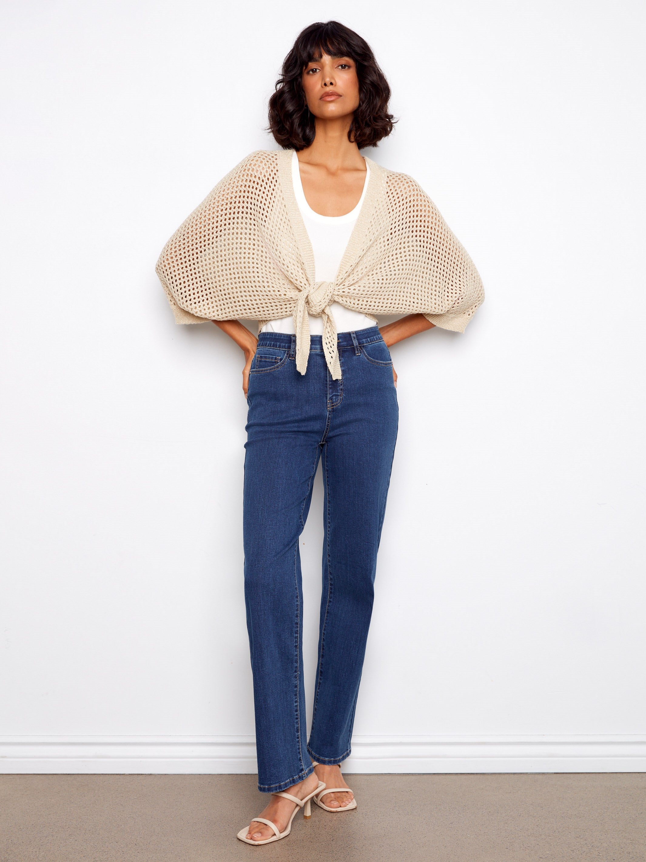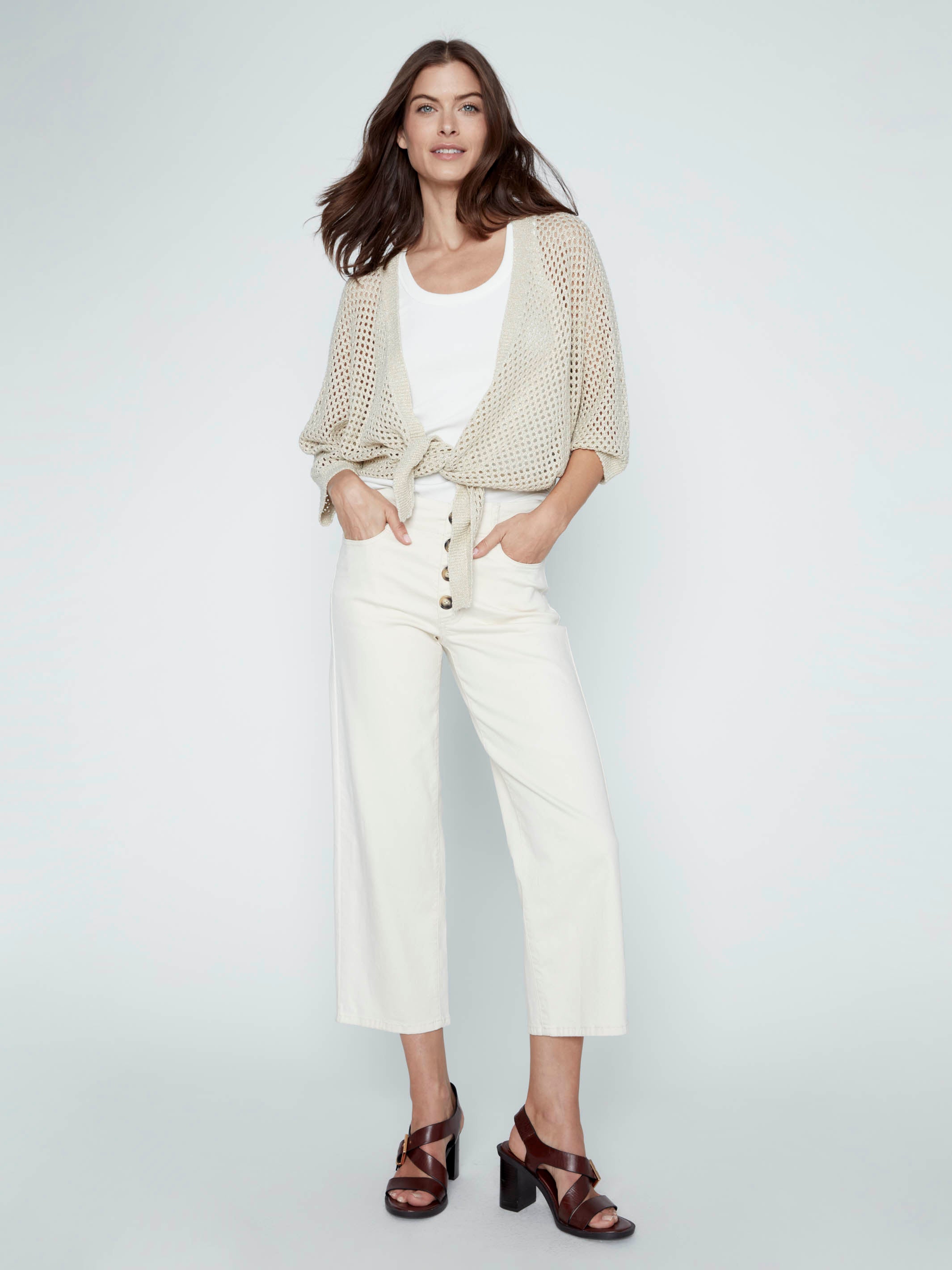 Add a touch of glamour to your spring wardrobe with our crochet lurex bolero, enhanced by a golden shimmer that won’t go unnoticed. Featuring elbow-length dolman sleeves and a tie-front detail, it delivers effortless style with any outfit. Elevate your look with this versatile piece!