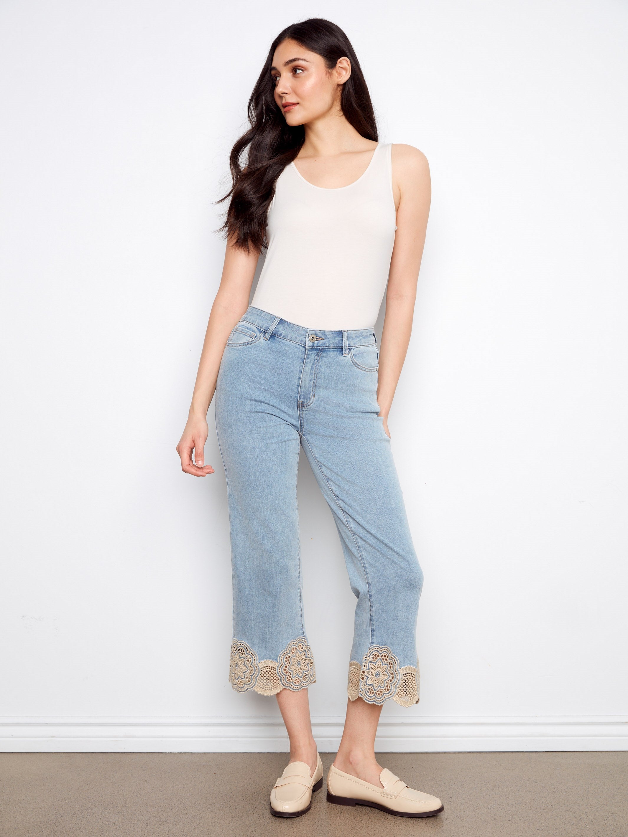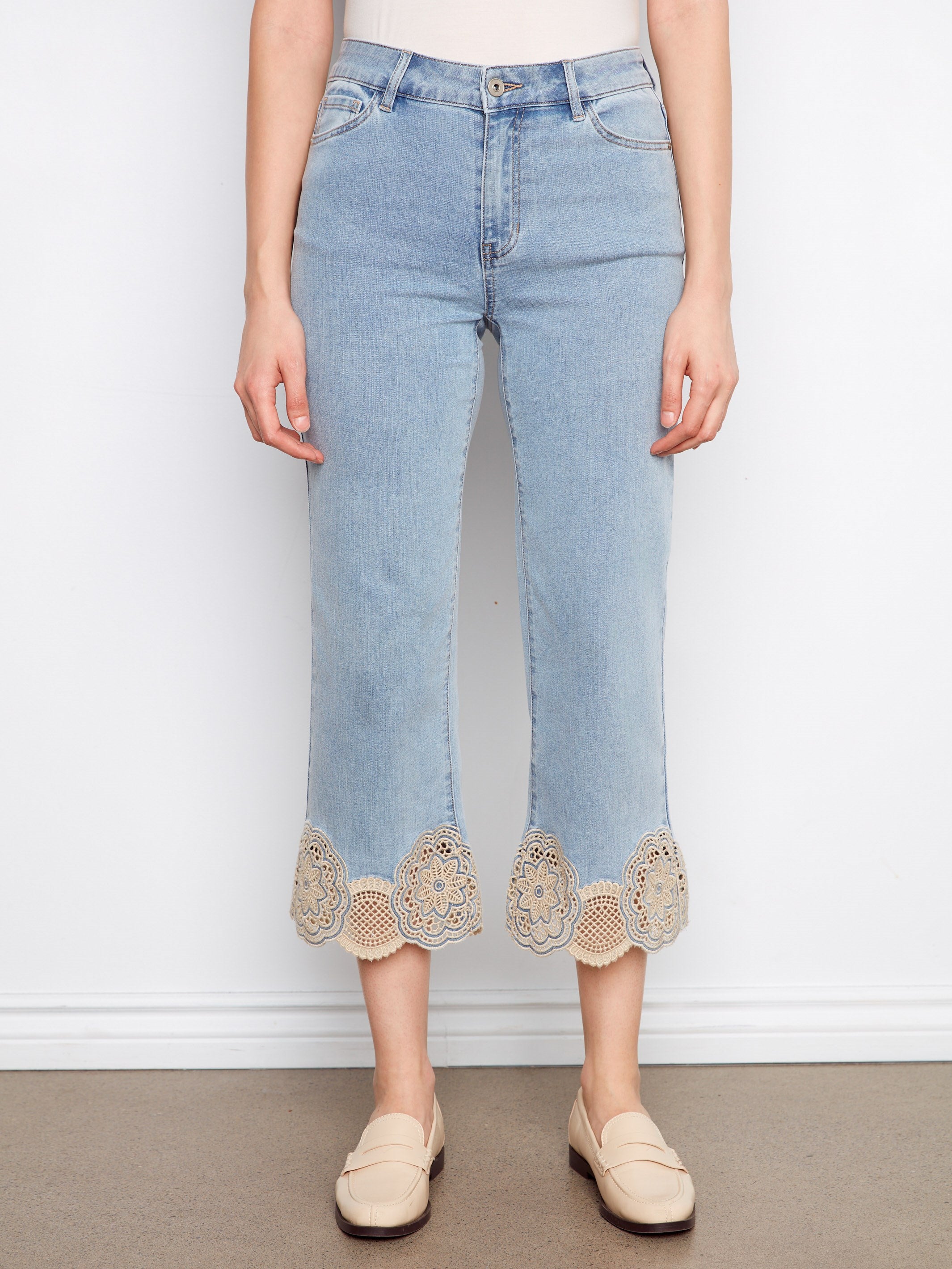 Cropped Flare Jeans With Lace Hem - Light Blue