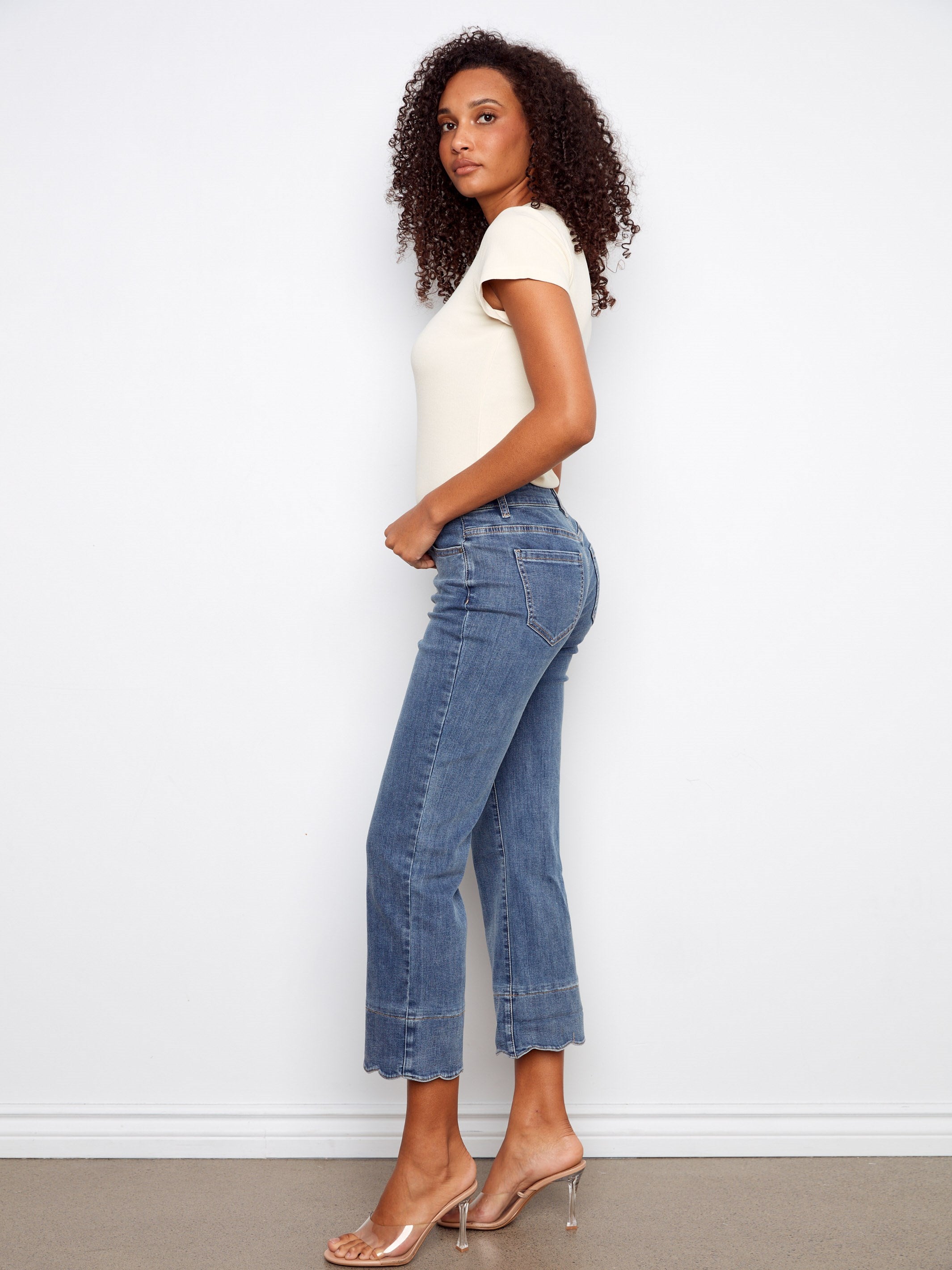 These medium blue jeans stand out with charming scalloped cuffs that add a delicate, feminine touch. Designed with comfortable stretch, they offer a flattering fit that moves with you throughout the day. Pair them with your favorite t-shirt for an effortless look that feels both fun and stylish.