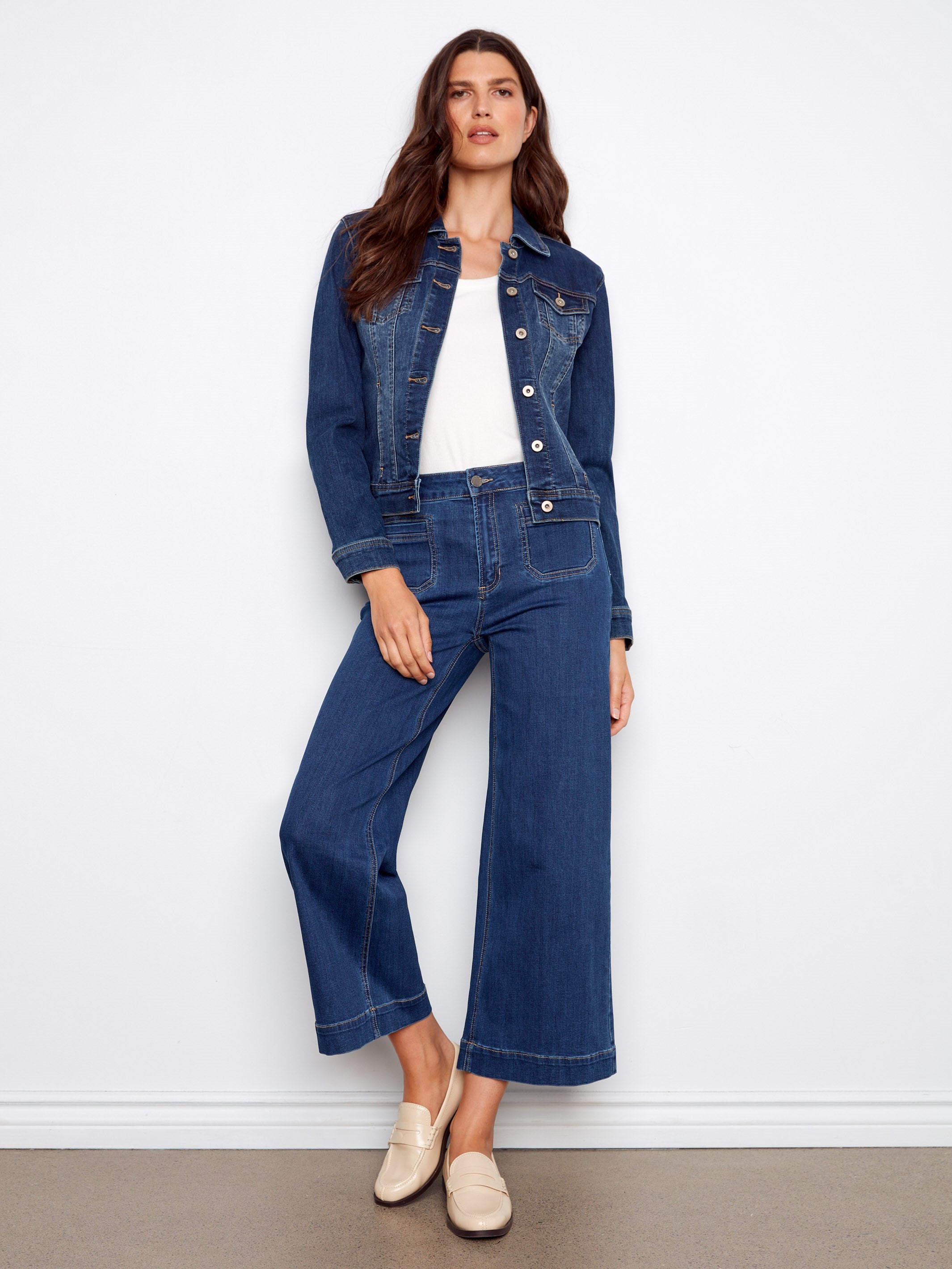 Step up your style game with our cropped flare jeans in a sophisticated indigo blue. Featuring trendy patch pockets and crafted from stretch denim, they ensure both comfort and a flattering fit. Perfect for casual days or elevating your look with a dressy top, these jeans are a spring wardrobe must-have for fashion-forward individuals.