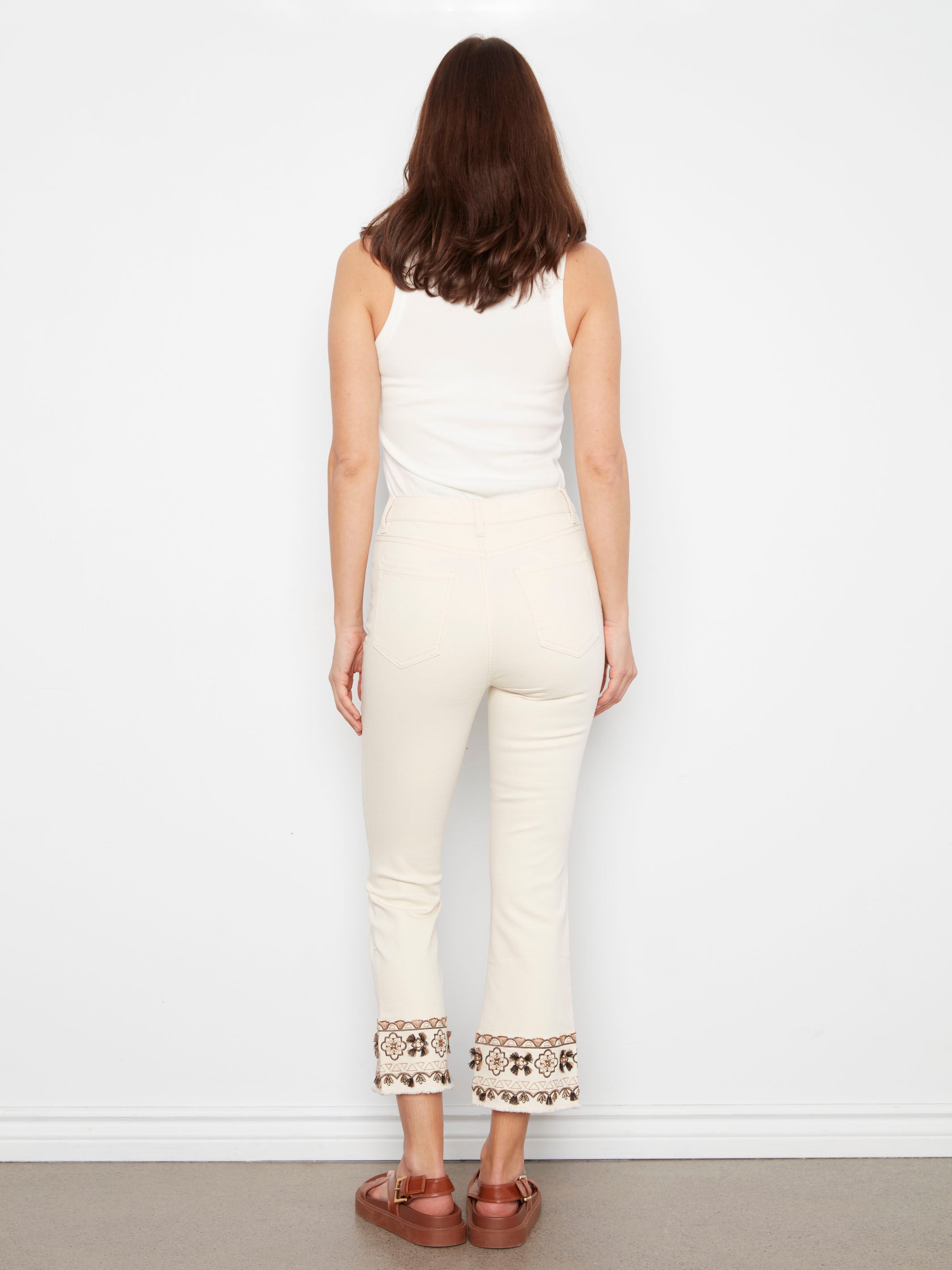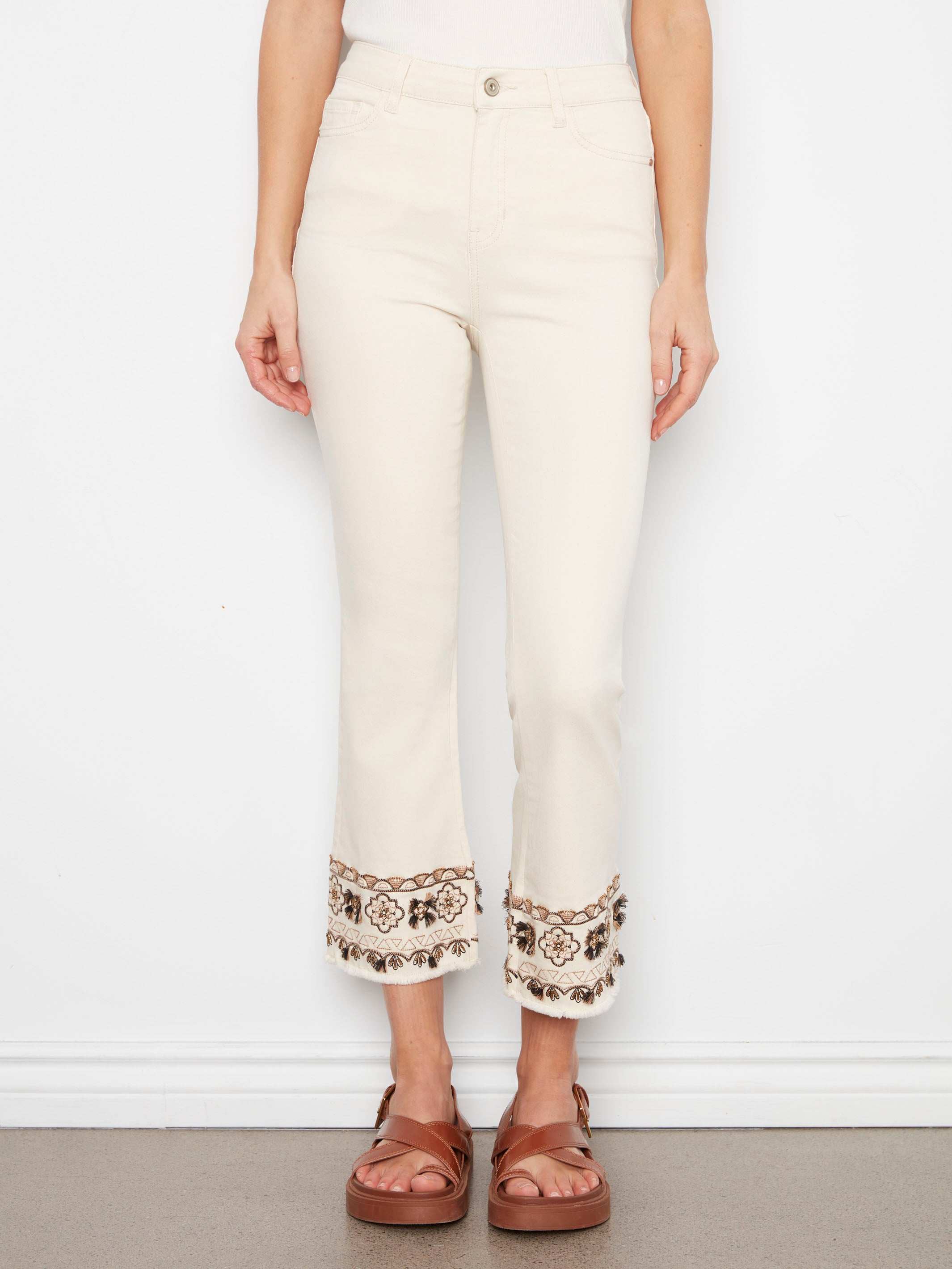 Cropped Twill Pants With Embroidered Hem - Natural