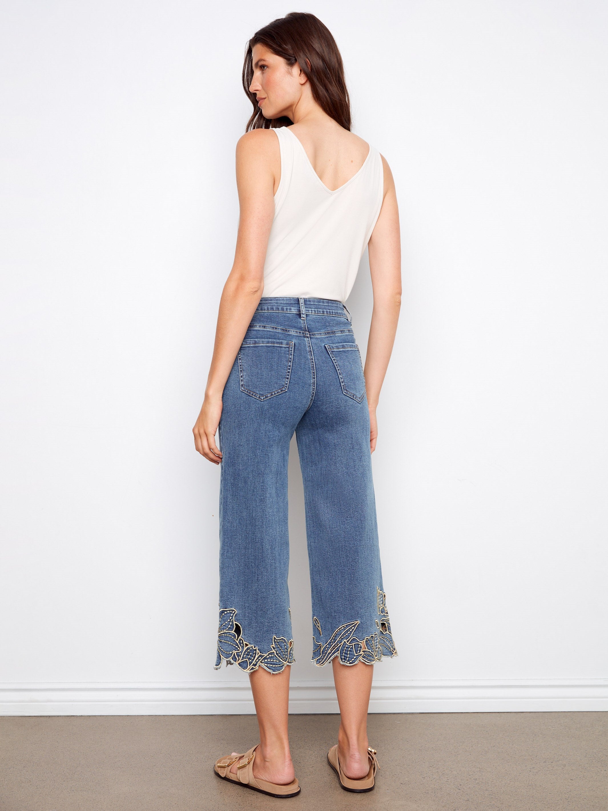 Cropped Wide Leg Jeans With Floral Embroidery - Medium Blue
