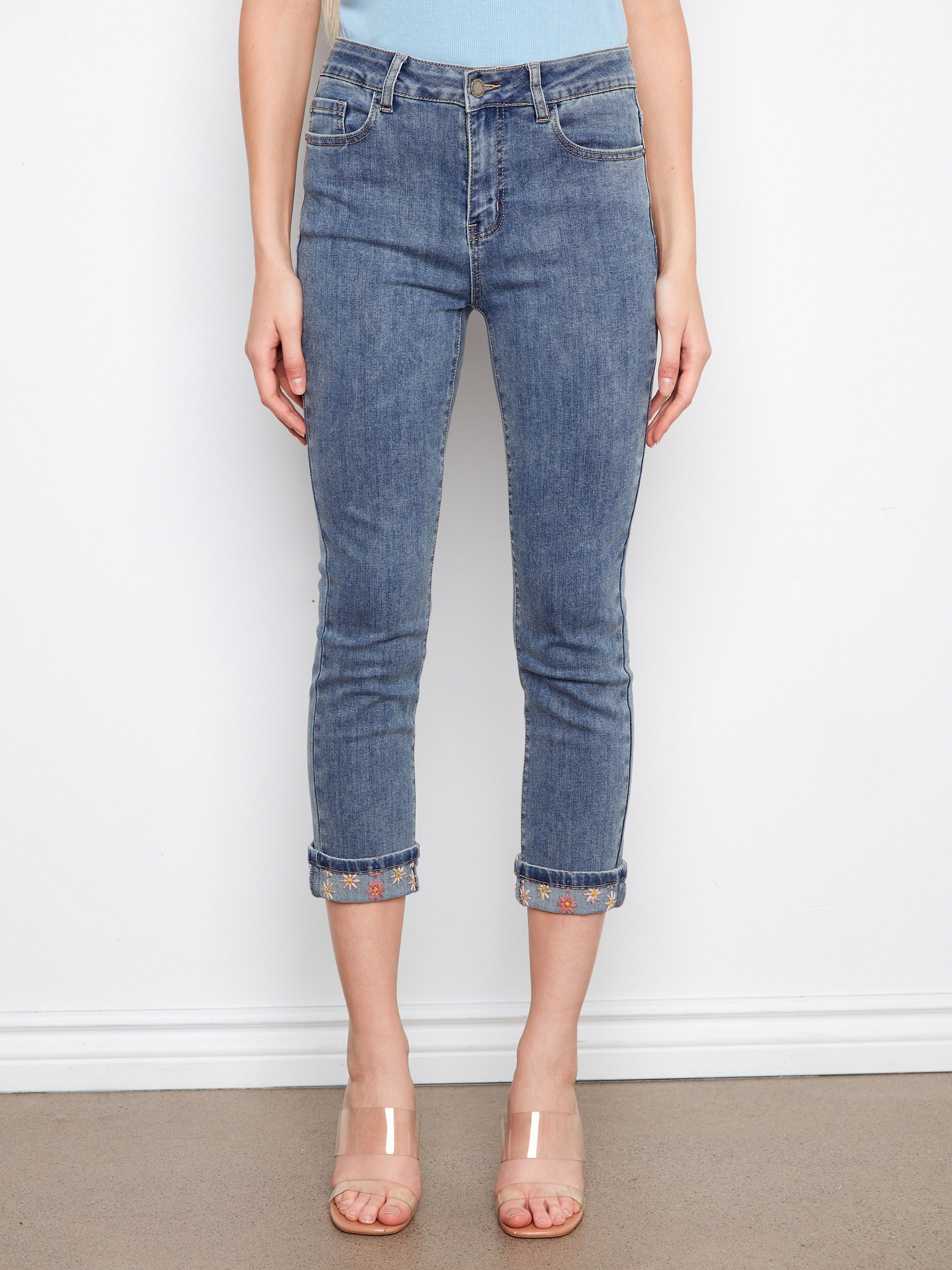 Playful elegance meets everyday style with these medium blue jeans. Embroidered cuffs add a creative touch, while the cropped length and slim fit create a flattering silhouette with comfortable movement. A fun yet wearable way to express your artistic side.