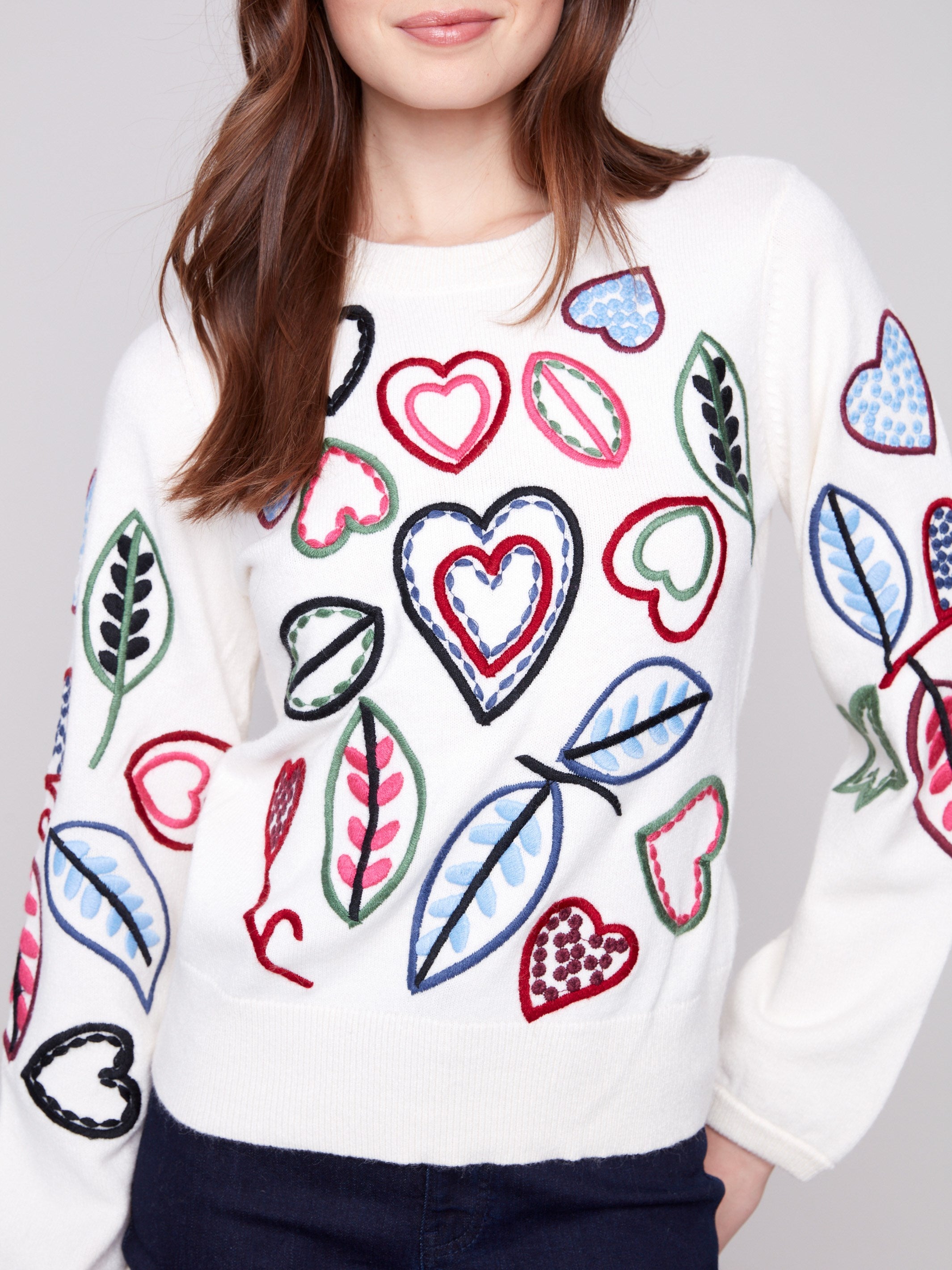 Embroidered Hearts & Leaves Sweater - Ecru