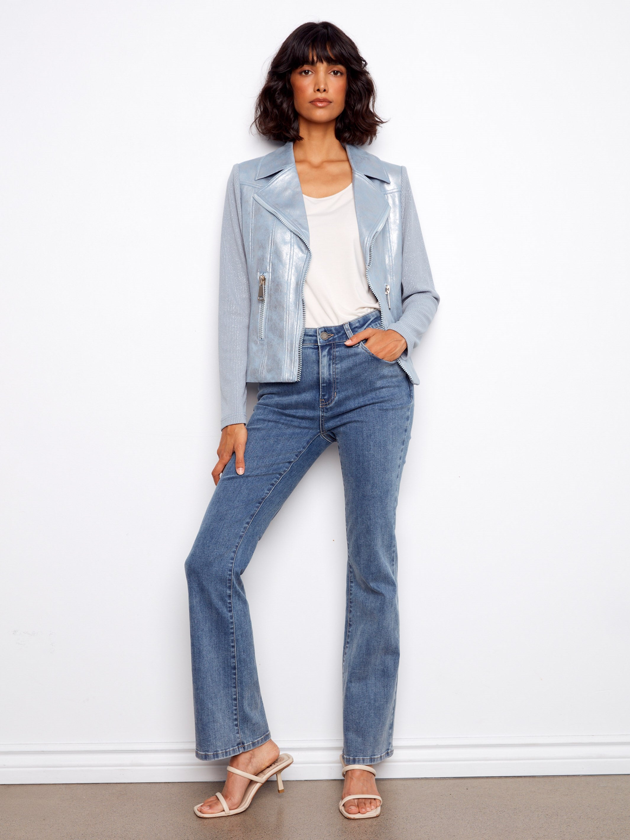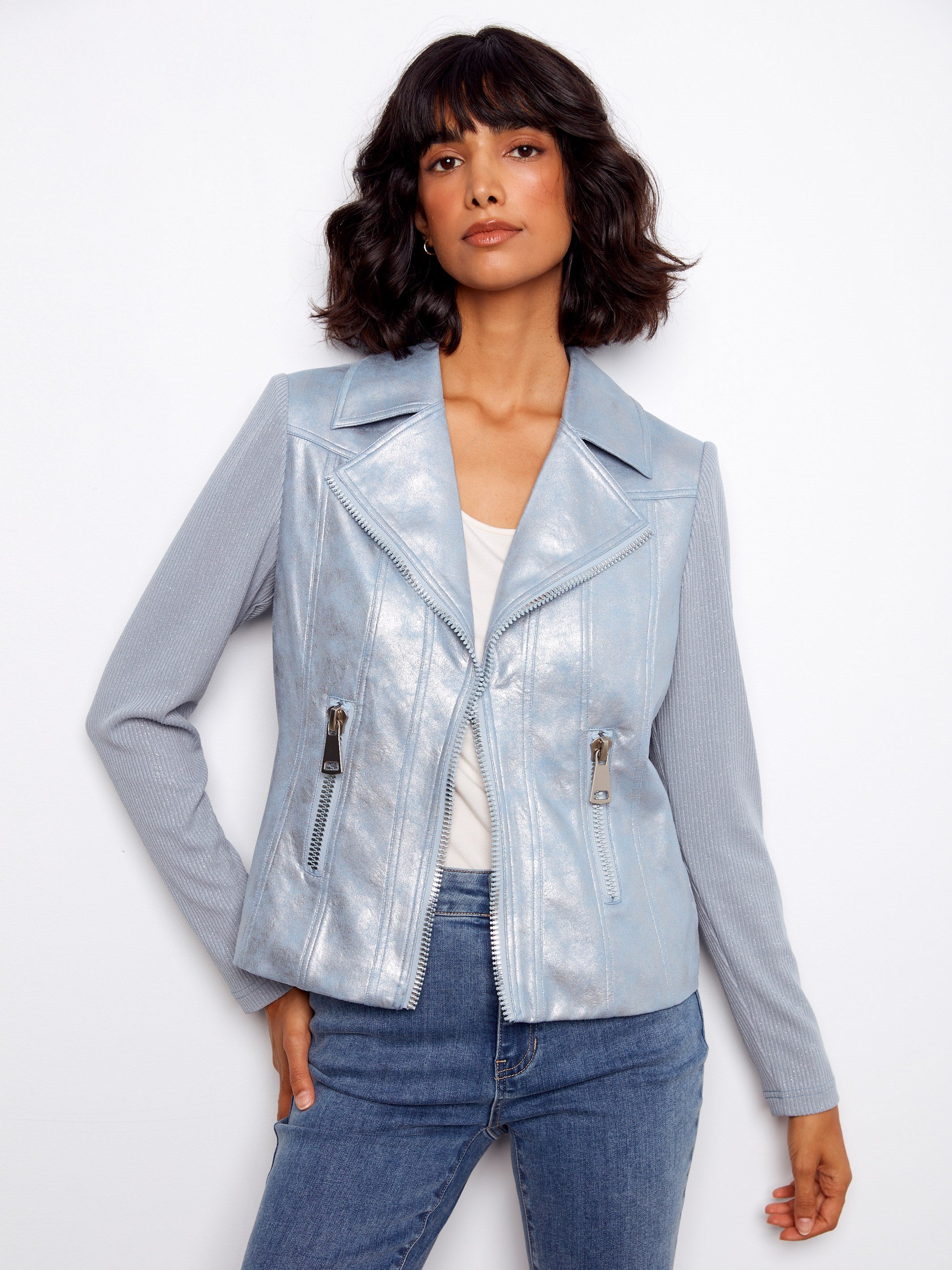 Upgrade your spring wardrobe with this standout Foiled Faux Leather and Rib Knit Jacket. Finished in a shimmering metallic blue, it adds a bold edge to any outfit. A lapel notch collar and long rib knit sleeves create a sleek, modern look that’s perfect for making a statement.
