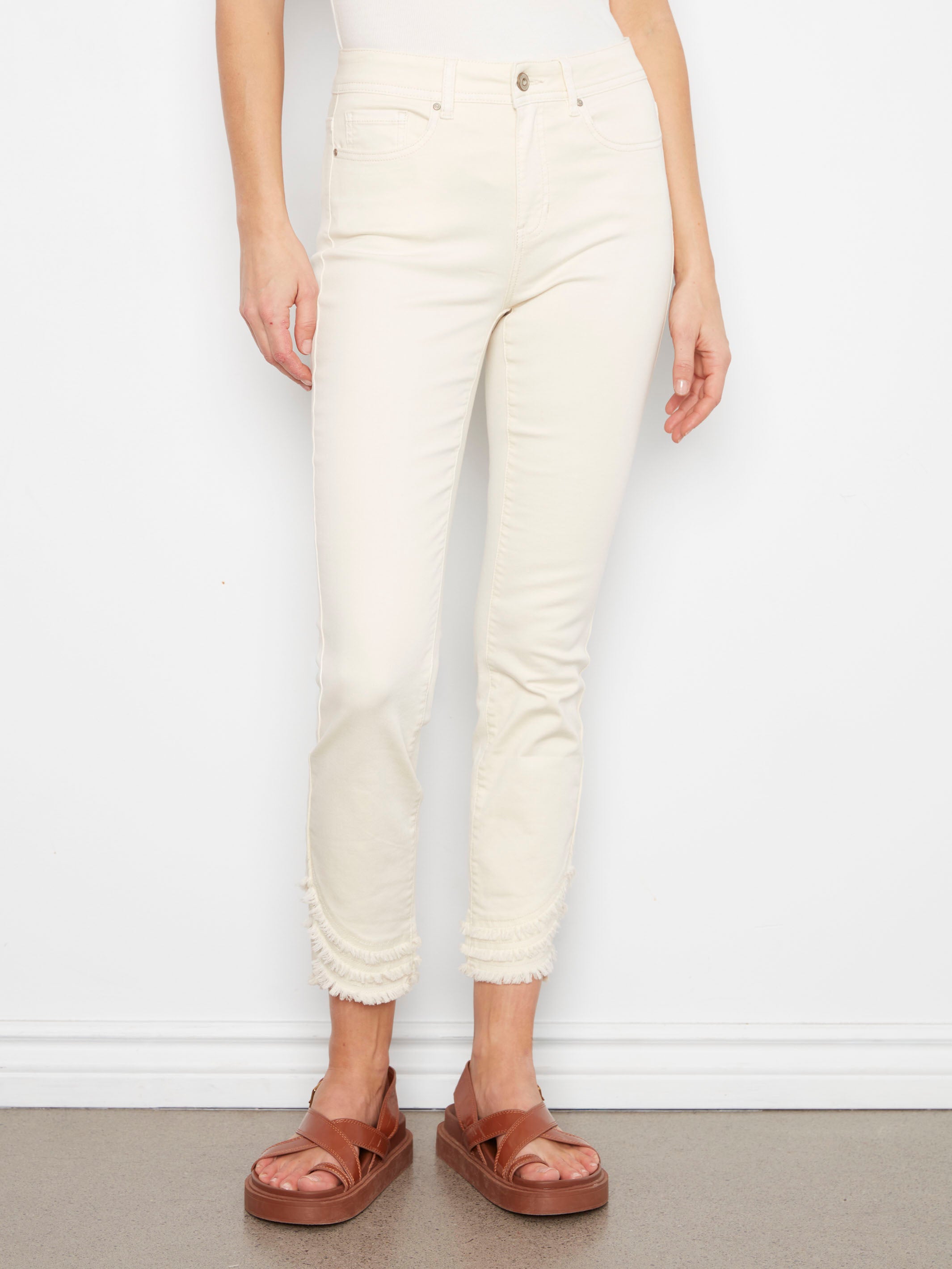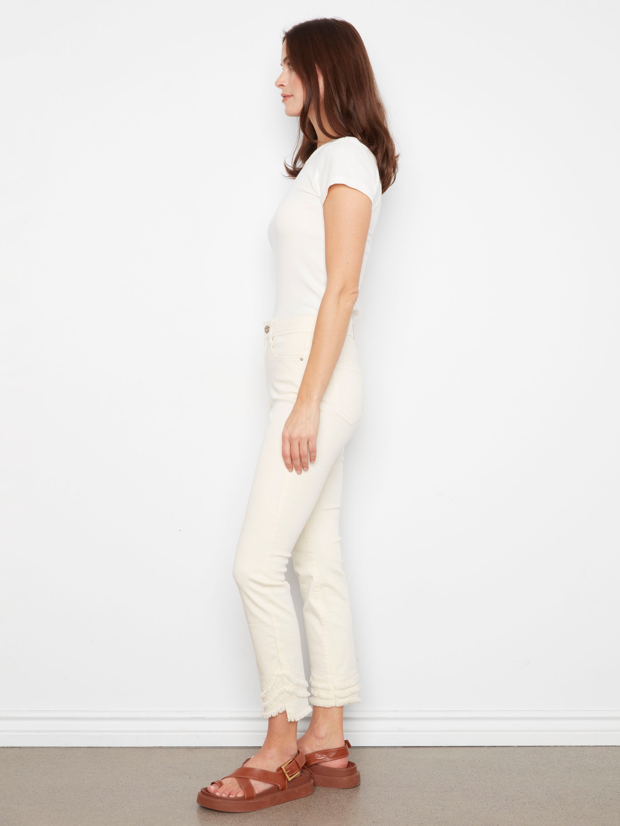 Discover the perfect mix of style and comfort with our twill pants, featuring frayed hems for an effortlessly stylish look. The soft natural off-white color, combined with stretchy fabric, ensures a comfortable and flattering fit. These pants are the ultimate addition to elevate any spring wardrobe with a trendy, modern touch.