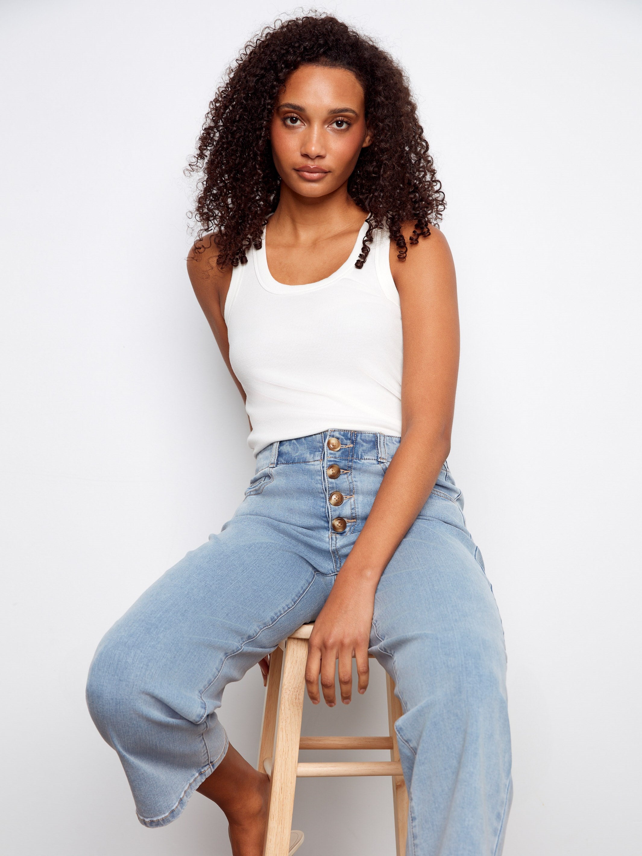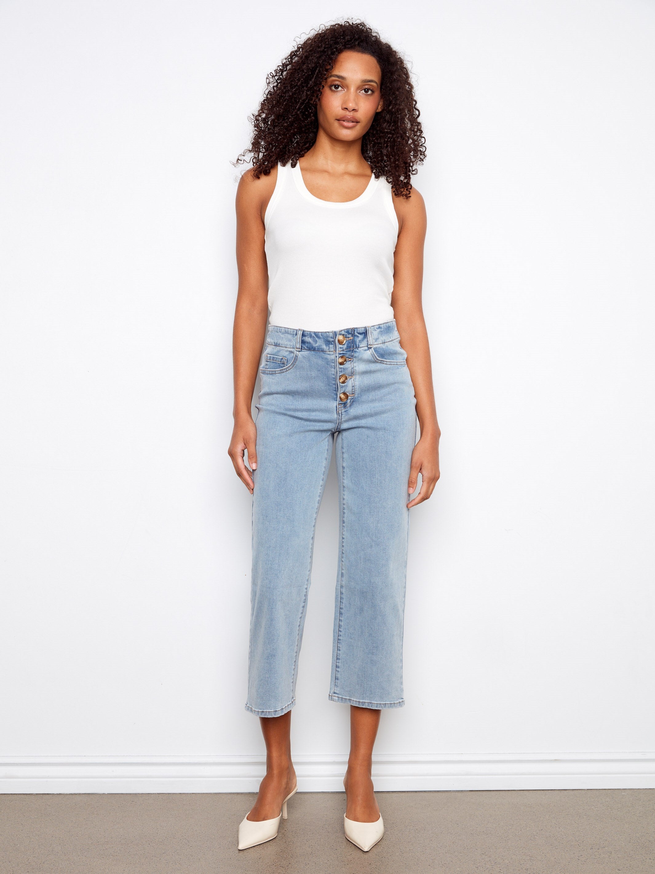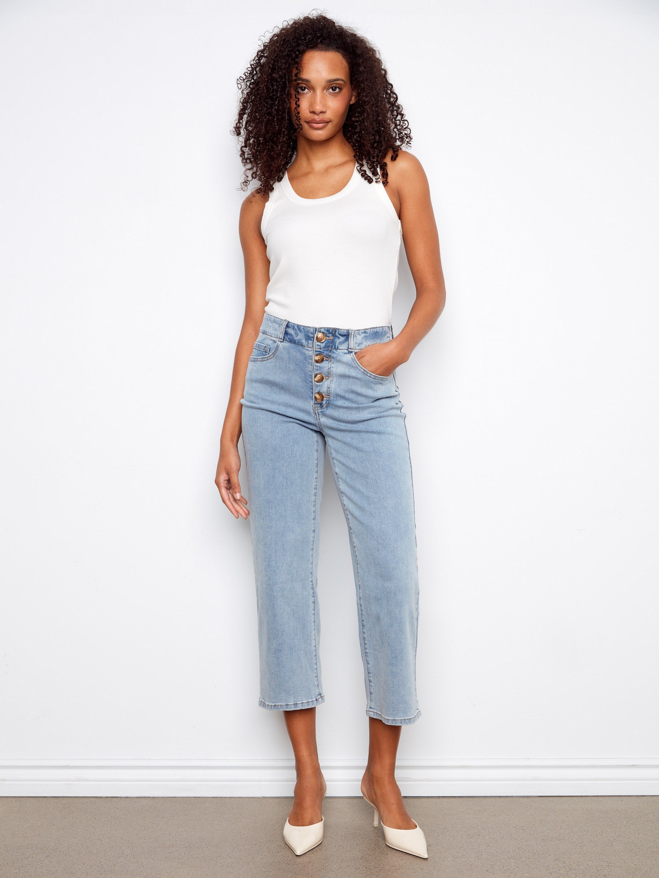 Our light blue cropped jeans offer an effortless chic look. Designed with a button fly and a straight-leg cut, they're perfect for relaxing days. Just put them on, and you're ready to face the day feeling stylish and comfortable!
