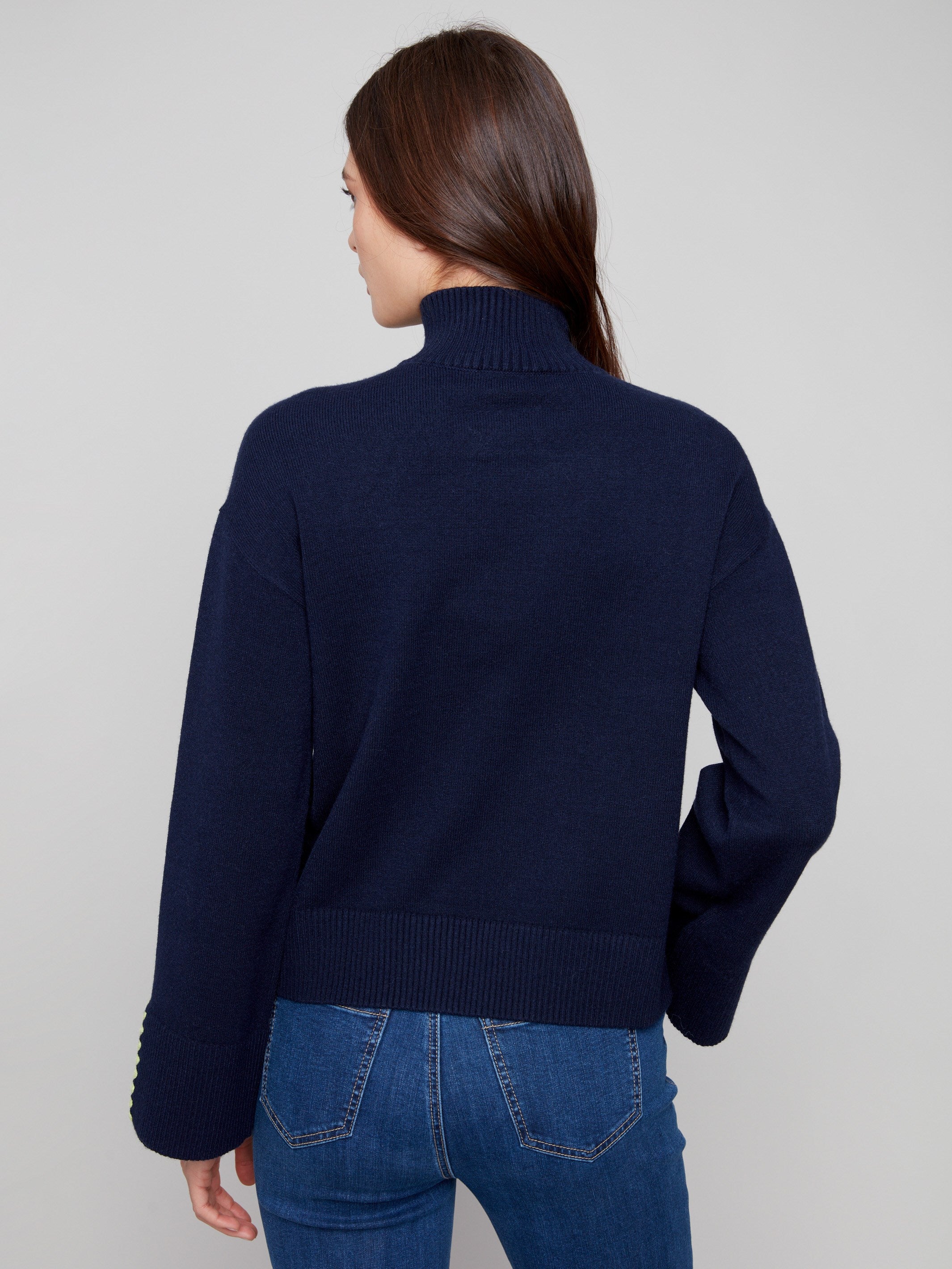 Mock Neck Sweater With Zipper & Crochet Details - Navy