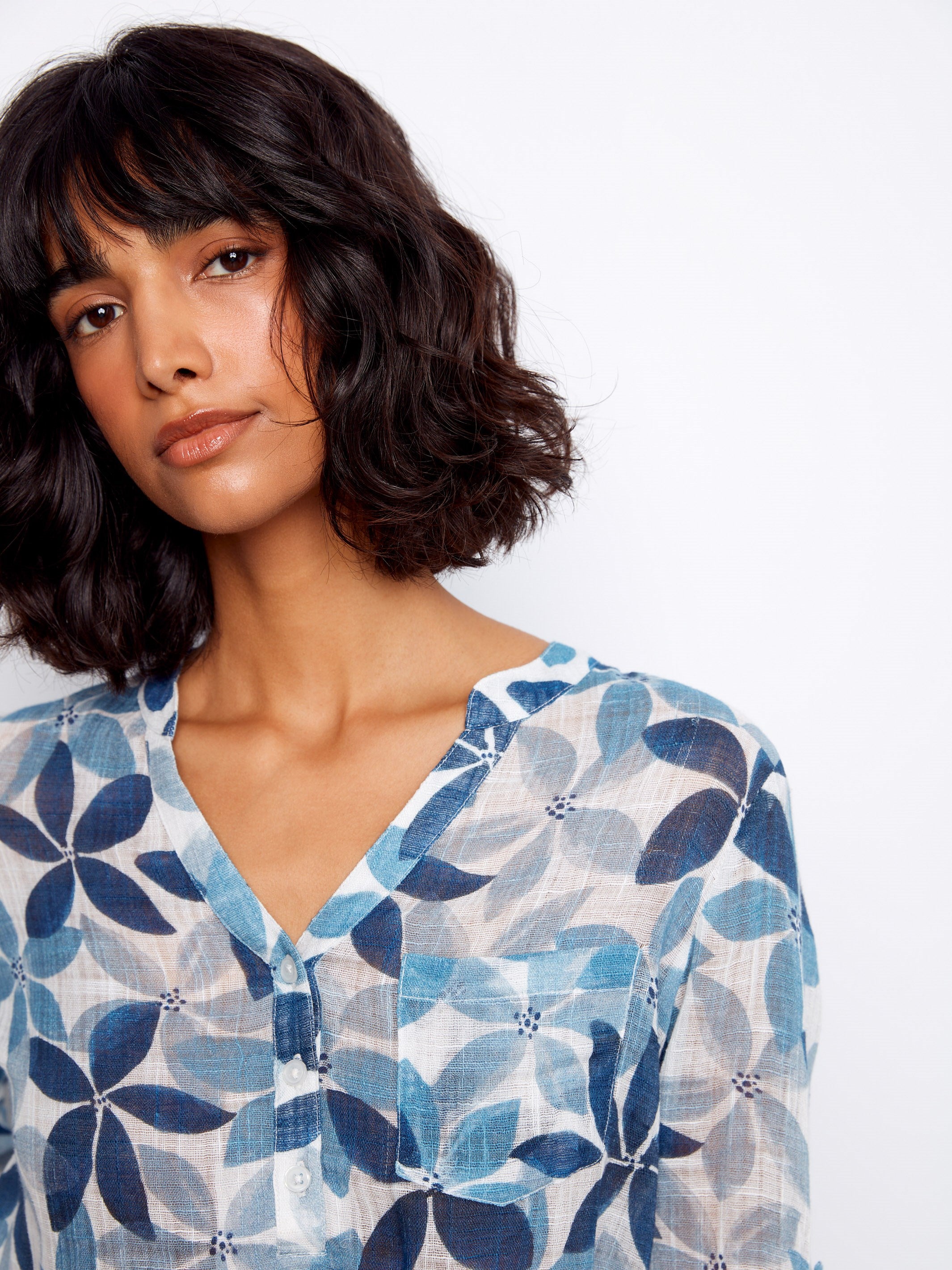 Revitalize your spring-summer collection with our exquisite cotton gauze blouse, adorned with enchanting floral patterns in soothing blue tones. Crafted from fabric as delicate as a gentle breeze, it features a Henley neckline and a chest pocket for a laid-back appeal. The playful roll-up sleeves make it ideal for any event, making this piece an essential wardrobe staple!