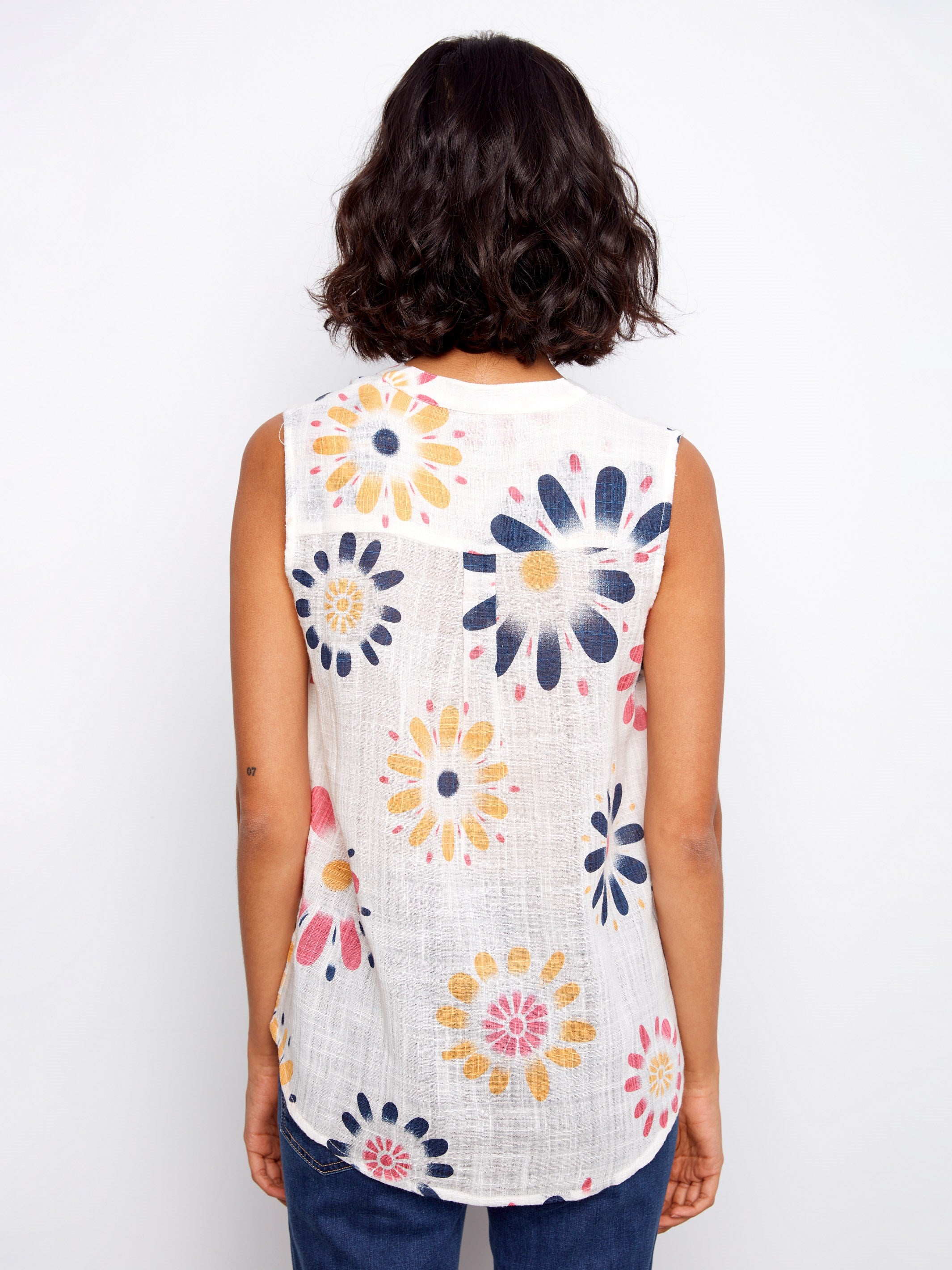 The sleeveless blouse offers a breezy elegance with its playful daisy print on soft, airy fabric. Featuring a Henley neckline for a bit of sophistication and a playful chest pocket for casual charm, this top is perfect for achieving a polished yet relaxed look. It's your go-to choice for easy style and comfort.