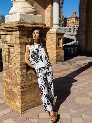 Embrace relaxed elegance this spring with these cropped pants, featuring a bold black-and-white leaf print. Crafted from a soft linen blend, they offer a breezy wide-leg silhouette and practical patch pockets. Perfect for everything from casual daytime outings to stylish evenings, these versatile pants bring effortless charm to any look.