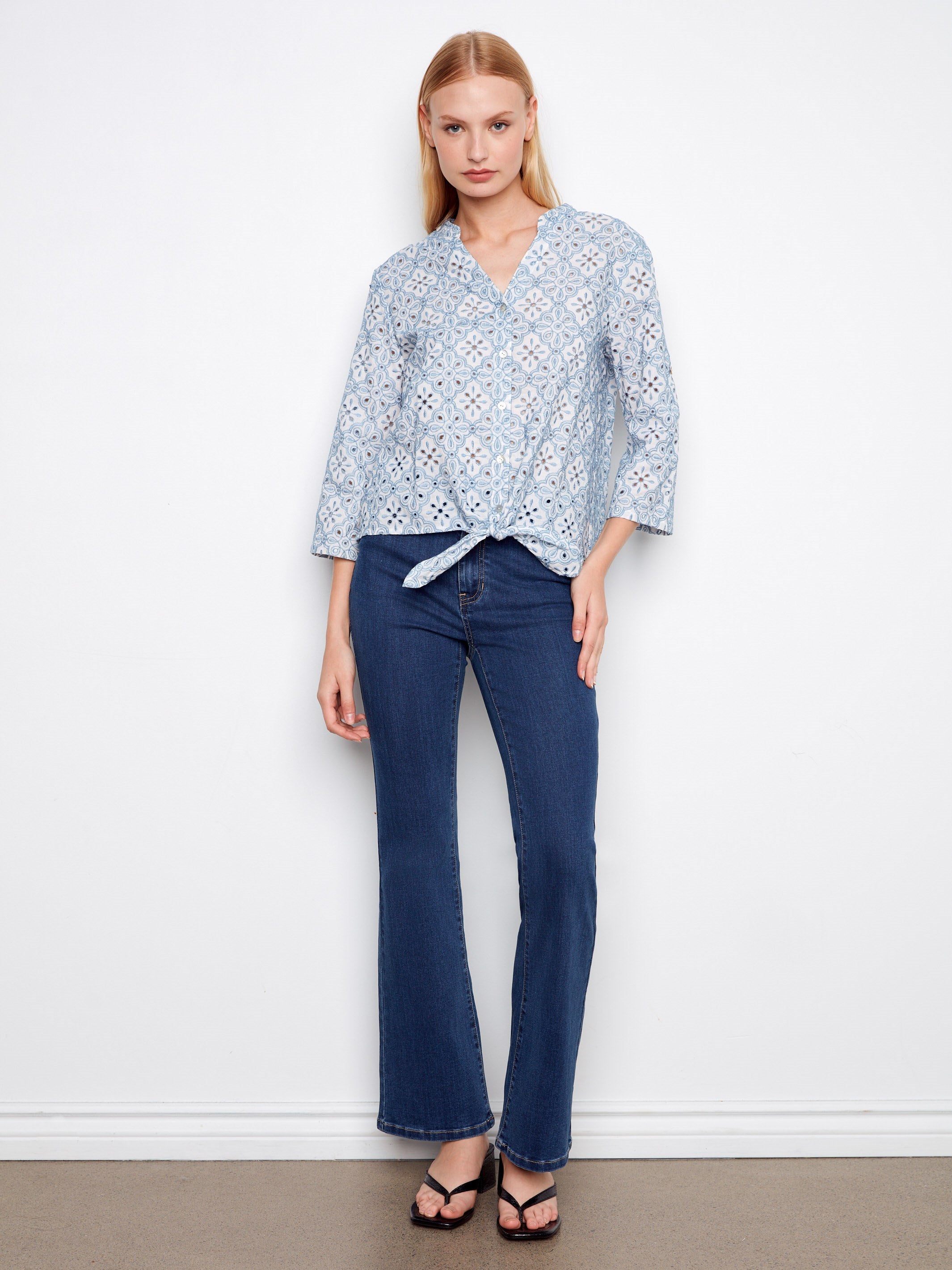 Experience effortless elegance with our eyelet cotton blouse, featuring intricate embroidery and a trendy front tie for a refreshing, breezy vibe. Its button-front closure and sophisticated Henley neckline make it ideal for any occasion. The 3/4 roll-up sleeves add versatility, letting you seamlessly transition between different settings.
