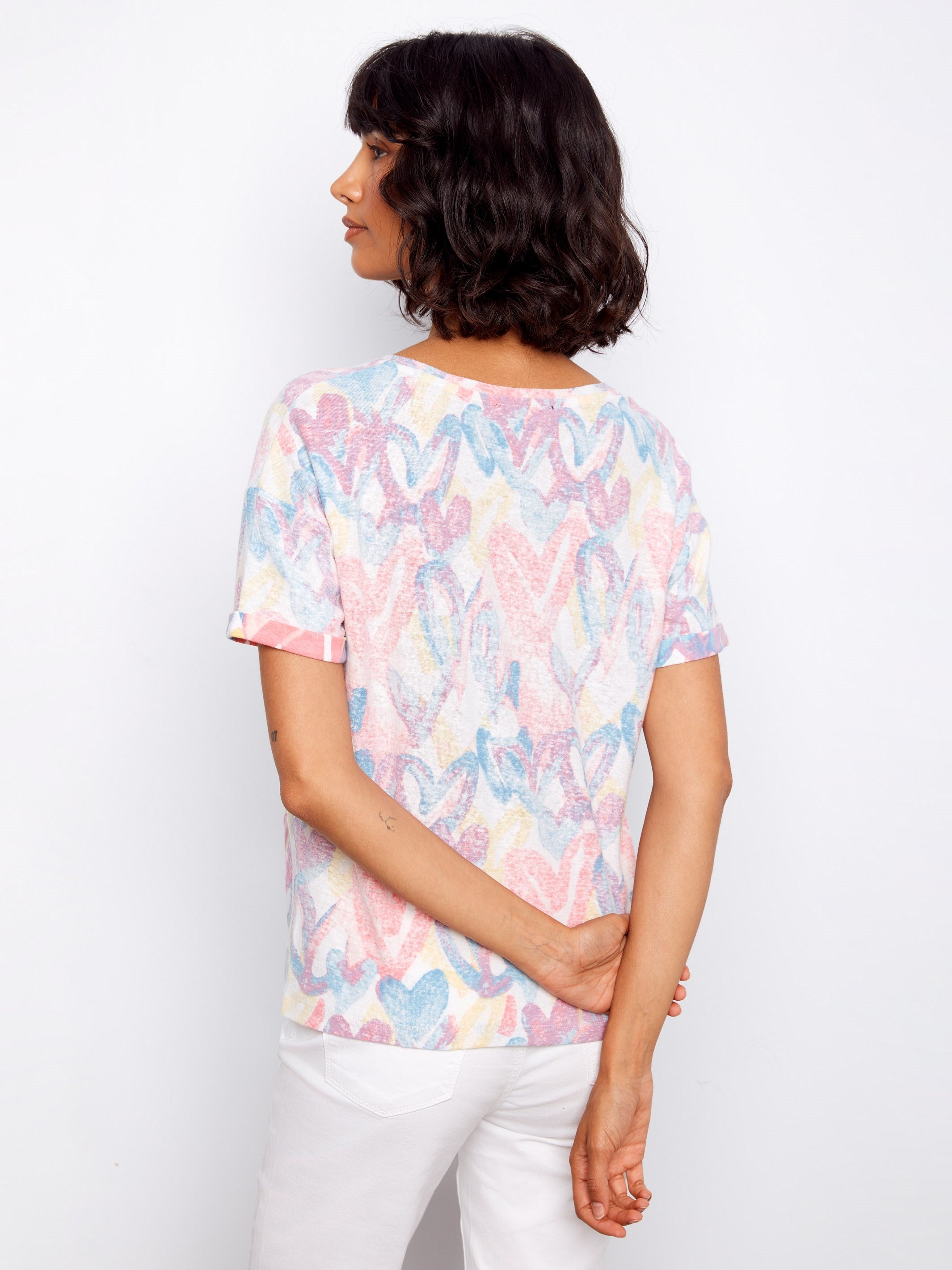 Jump into summer with this lively V-neck tee featuring a fun heart print. Its lightweight, breathable fabric and stylish knot detail make it ideal for any casual outing. Great for a day at the beach, a picnic, brunch in the park, a casual outing, or just a relaxed evening at home.