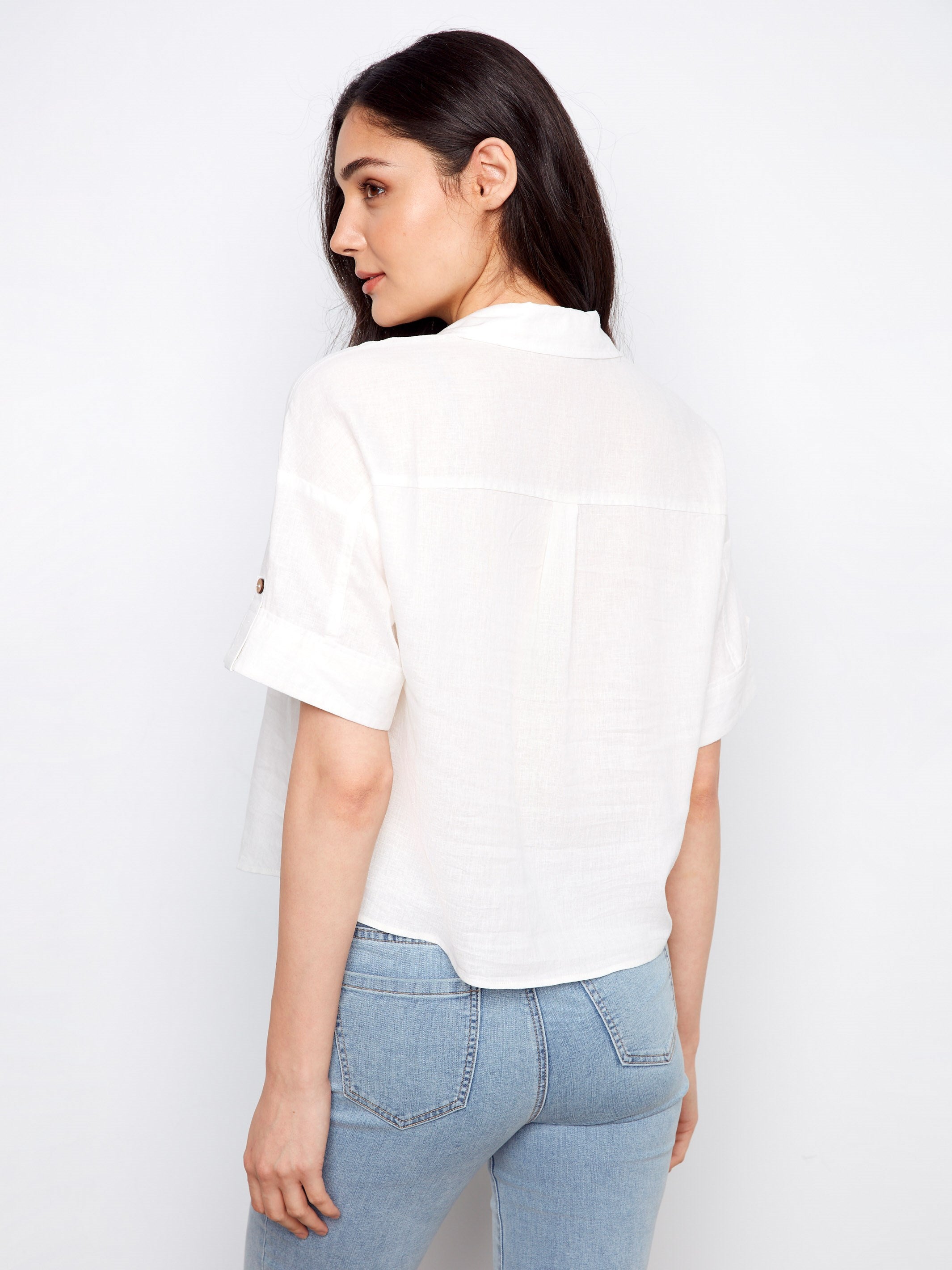 Short Sleeve Button-Front Linen Blend Shirt - White