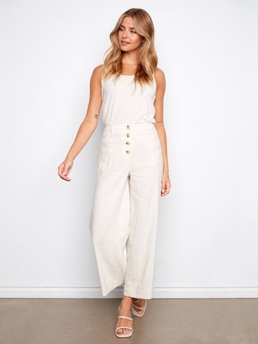 Stretch Linen Wide Leg Button-Front Pants - Natural
