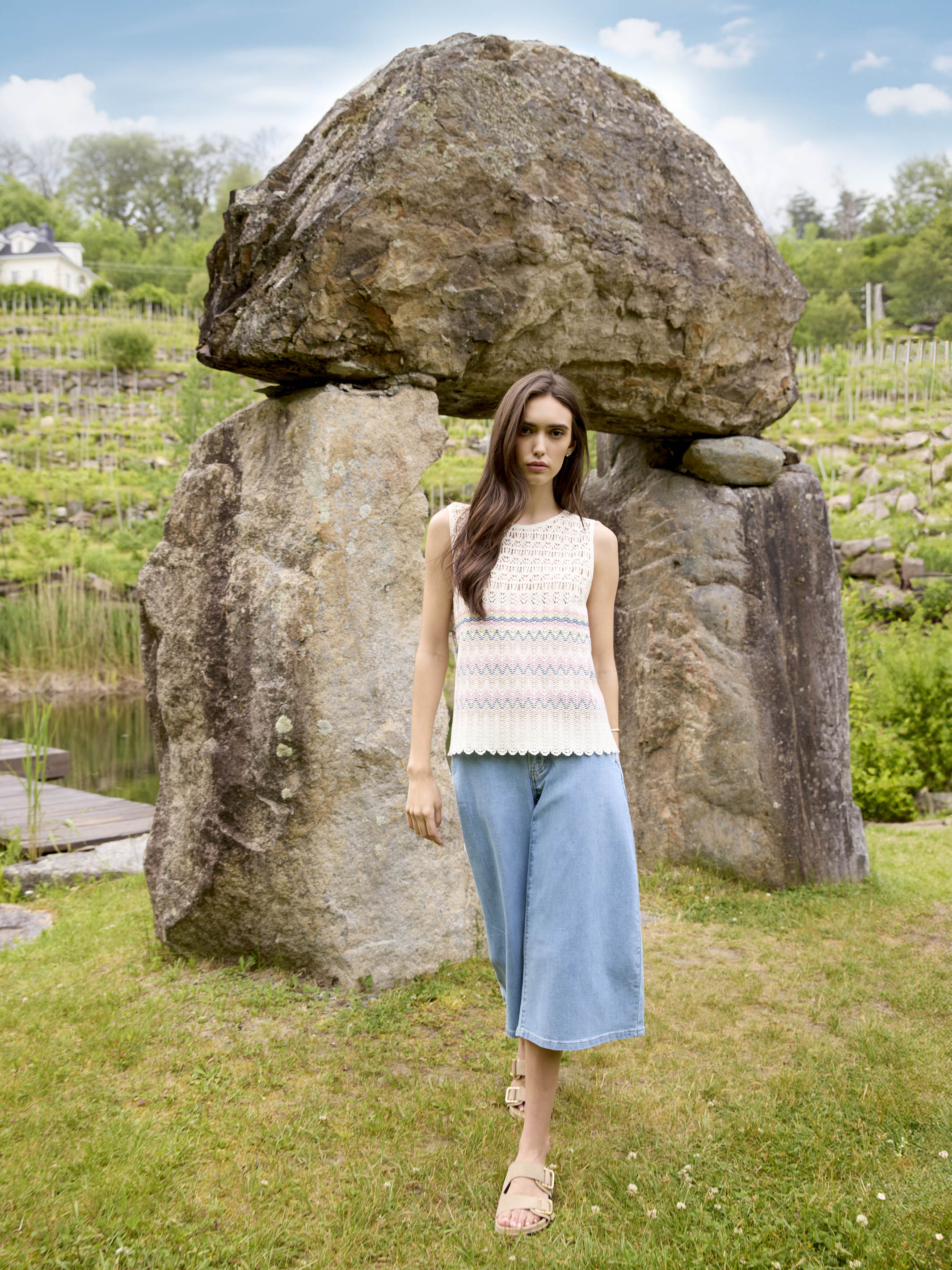 Get ready for summer with a charming crochet top that perfectly captures the spirit of the season. The striped design and scalloped edge add a playful touch to your look. Featuring a sleeveless silhouette and crafted from a breathable cotton blend, it’s ideal for warm days. Pair it with jeans for a laid-back feel.
