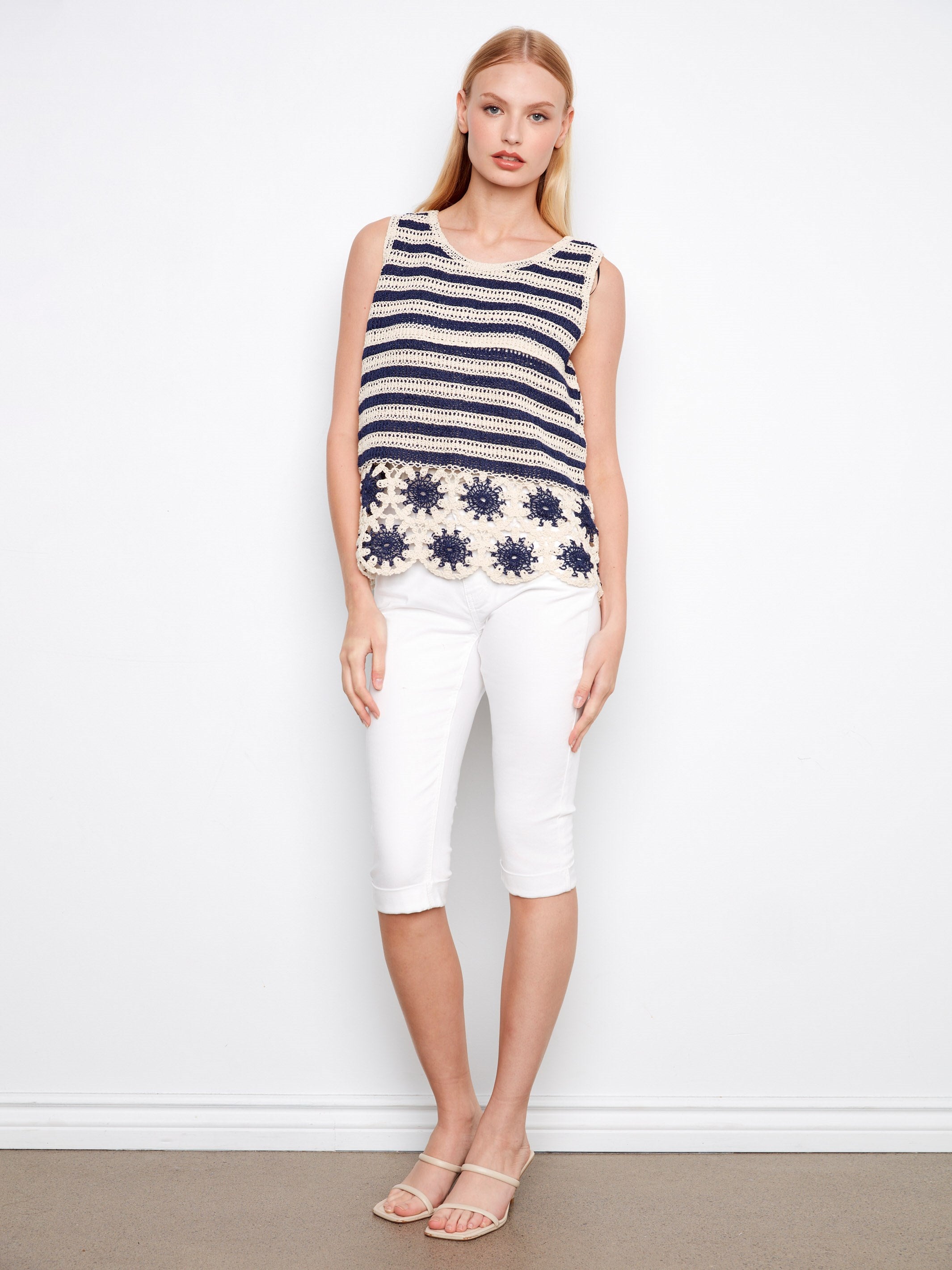 Striped Sleeveless Crochet Top With Floral Hem - Navy