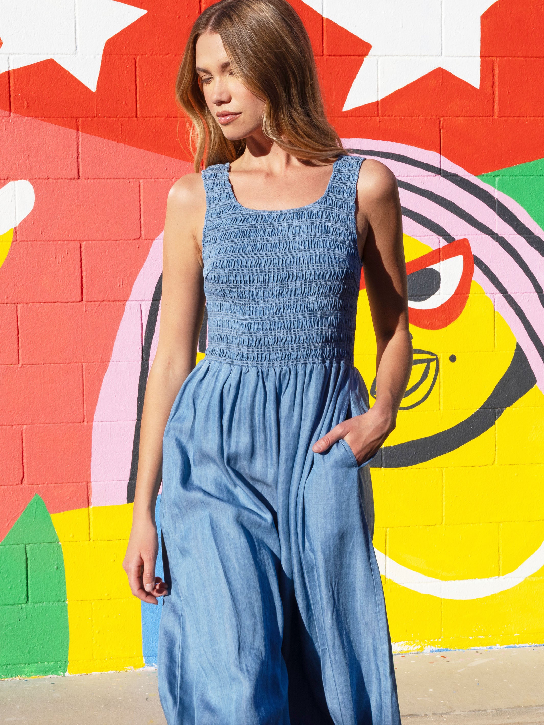 The smocked bodice softly shapes the silhouette, while the lightweight Tencel fabric drapes beautifully and moves with ease for all-day comfort and effortless style.